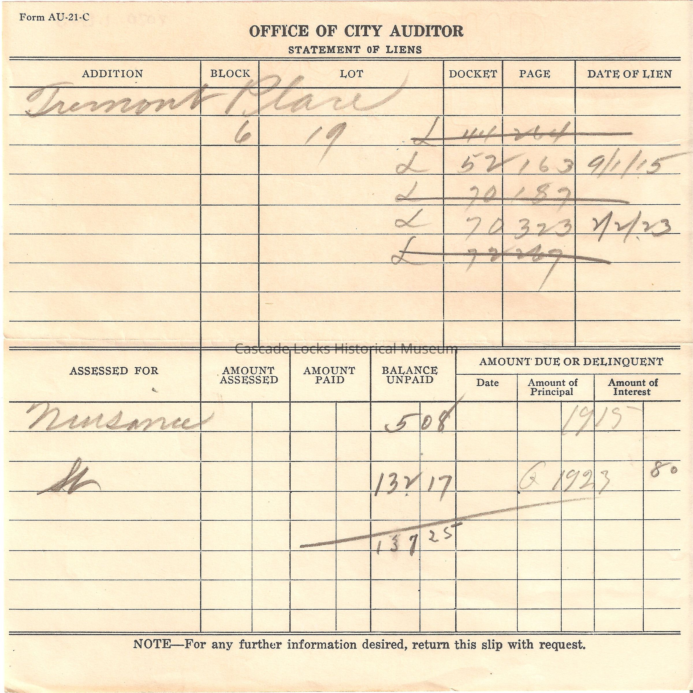 Form AU-21-C Office of City Auditor. Statement of Liens. Addition Fremont Place Block 6 Lot 19 Docket 44 Page 264, Docket 52 Page 163 9/1/1915, Docket 70 Page 187, Docket 70 Page 323 2/2/1923, Docket 72 Page 267.