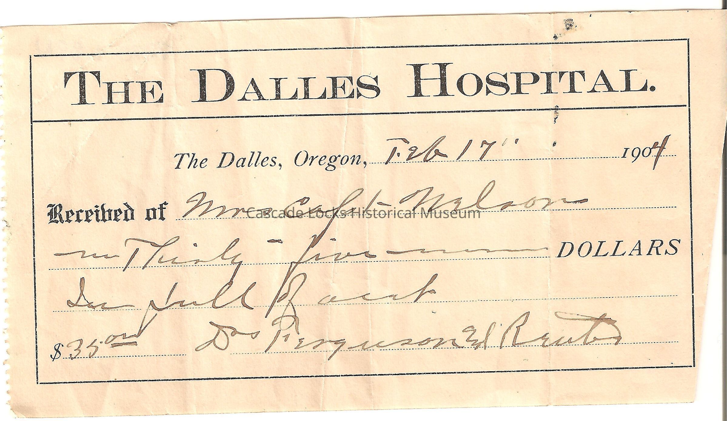 The Dalles Hospital, The Dalles, Oregon, Feb 17 1904. Received of Mrs. Capt Nelson. Thirty Five Dollars. Dr (eligible). $35.00 Dr. (eligible)
