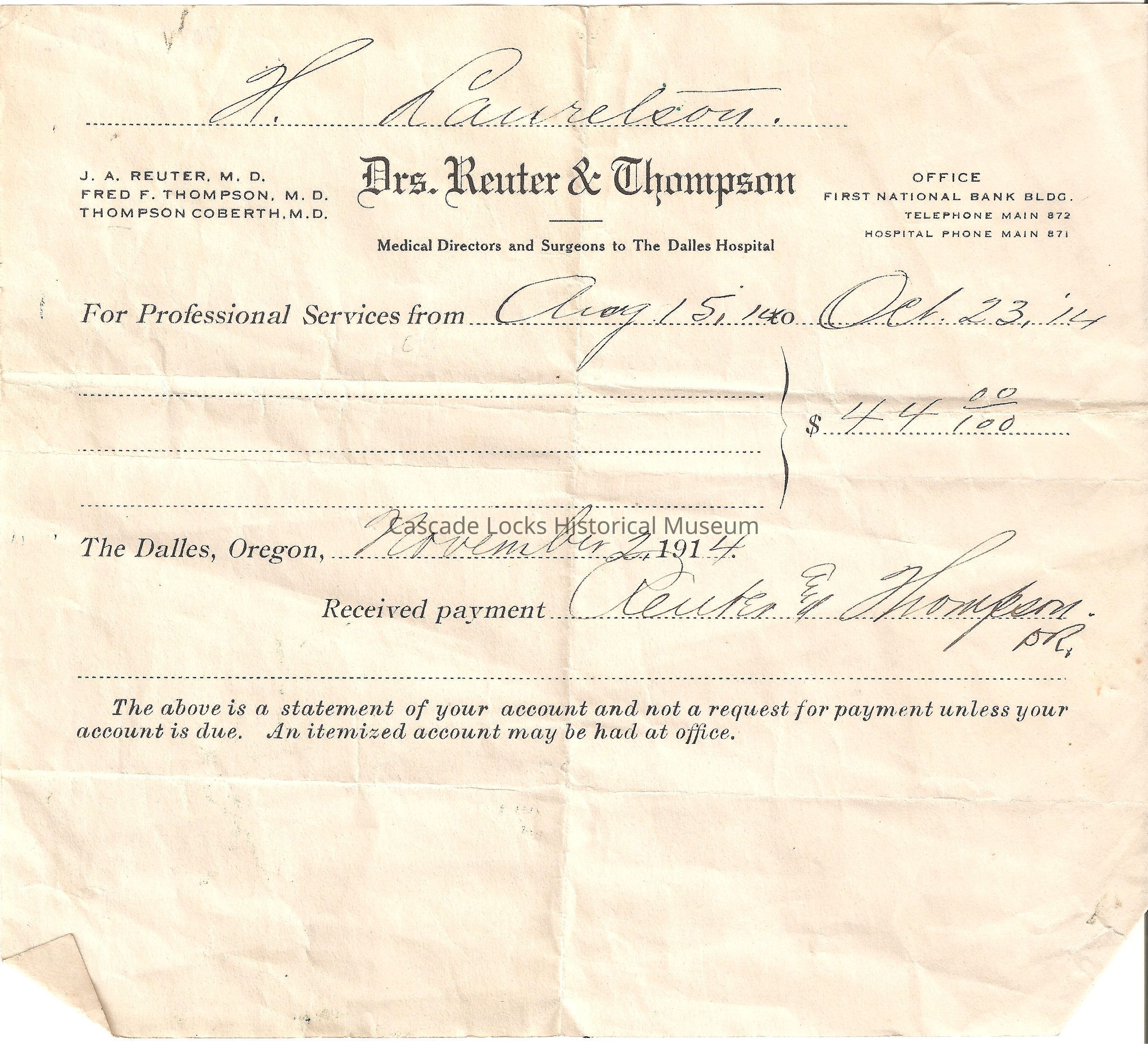 For professional services from Aug 15 1914 to Oct 23 1914. $40.00. The Dalles Oregon, November 2 1914. Received payment Reuter & Thompson Or.