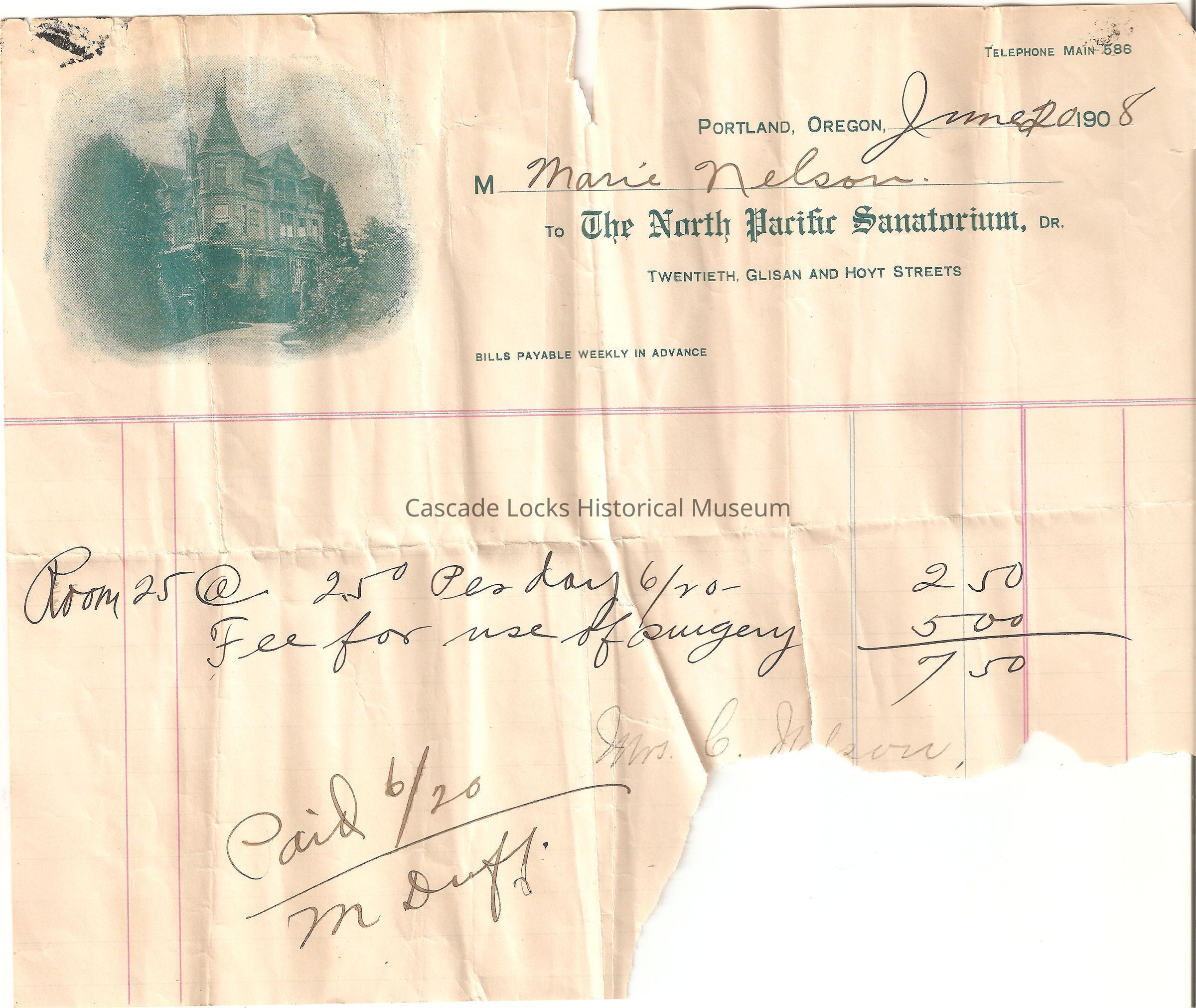 Telephone Main 586. Portland Oregon. June 20 1908. M Marie Nelson. To The North Pacific Sanatorium, Dr. Twentieth, Glisan and Hoyt streets. Bills payable weekly in advance.