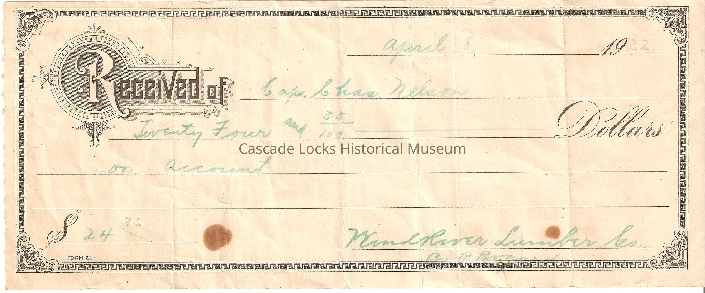 Receipt to Charles Nelson From Wind River Lumber CoEntry/Object ID
