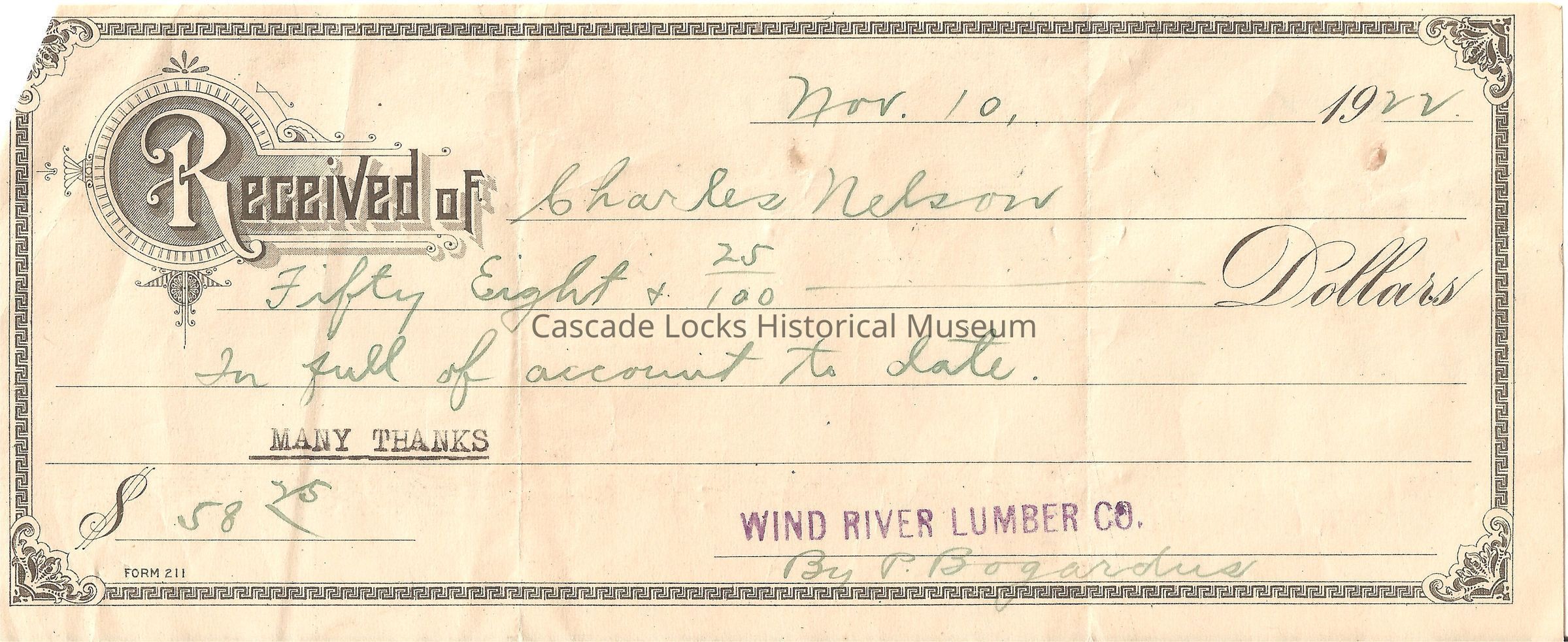 Receipt to Charles Nelson From Wind River Lumber Co.Entry/Object ID