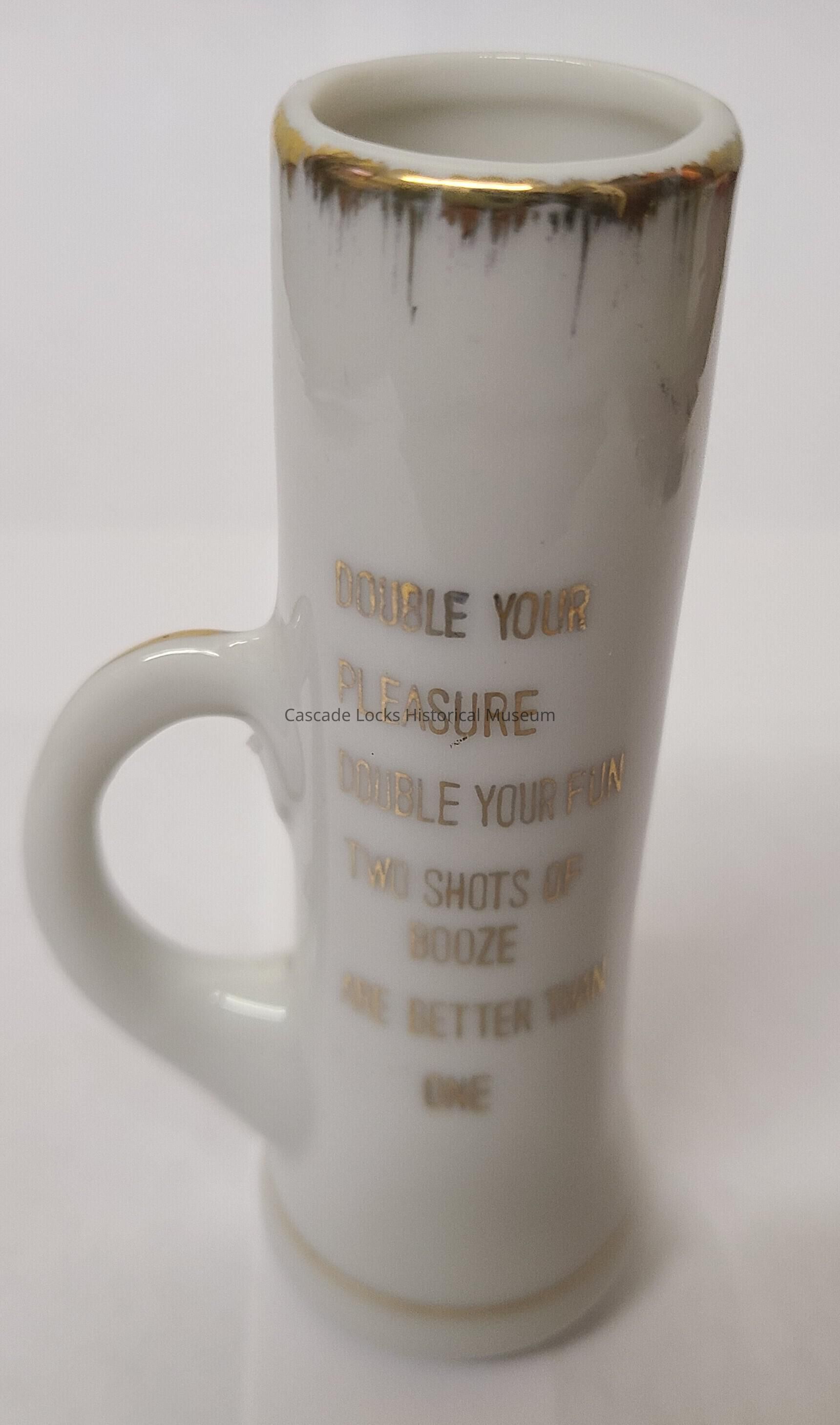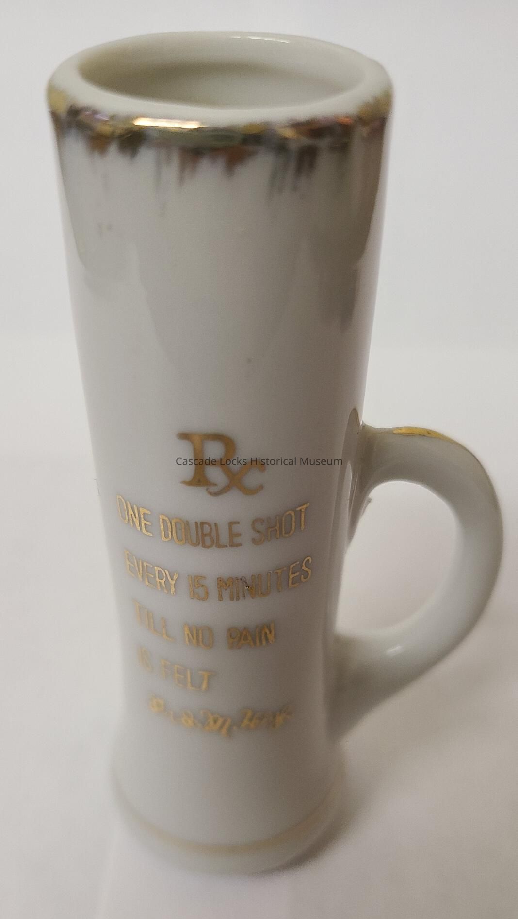 White ceramic double shot glass with handle. Written in gold font, "RX one double shit every 15 minutes til no pain is felt. Dr. I. M. Hirgh. Double your pleasure, double your fun, two shots of booze are better than one."