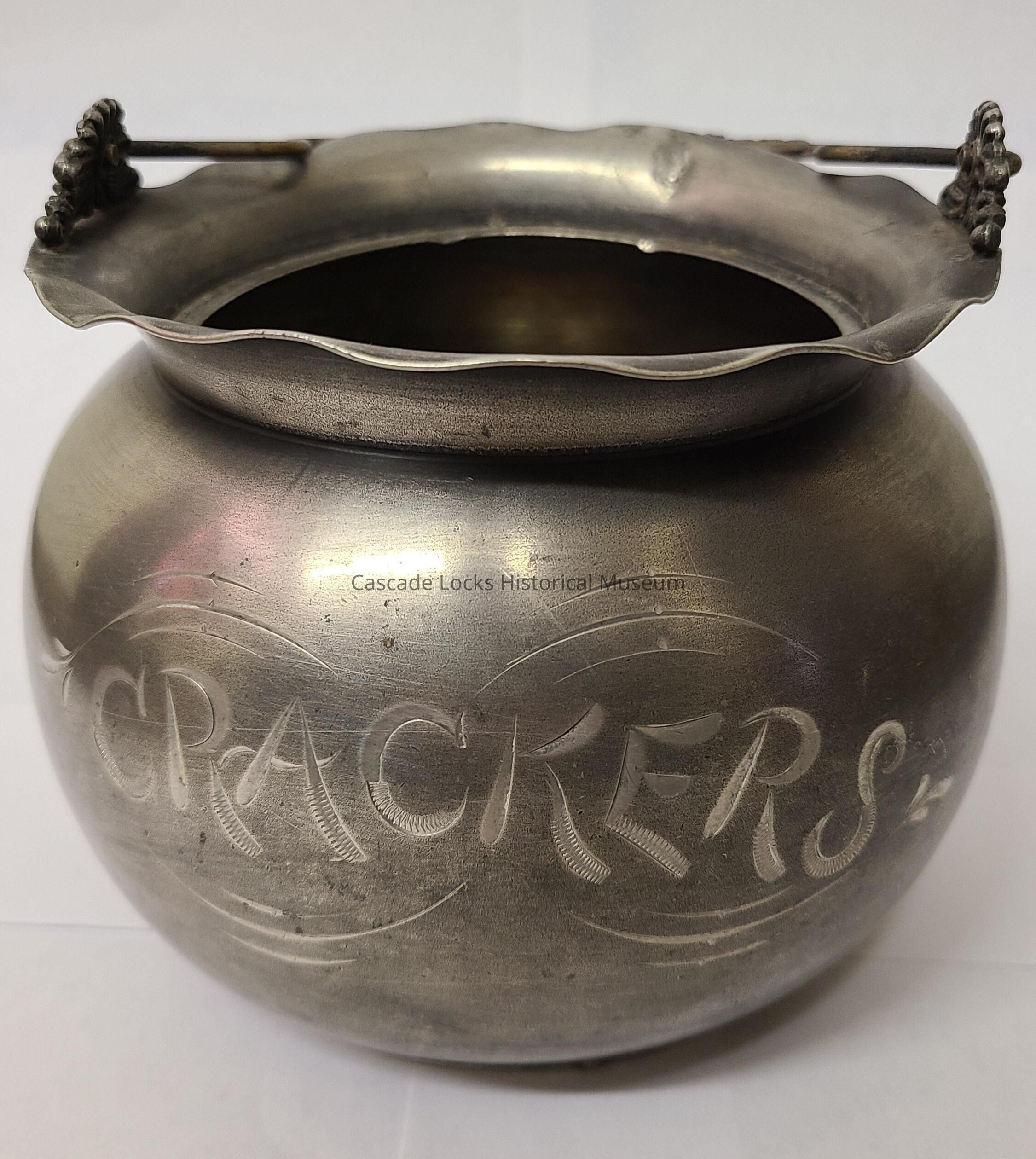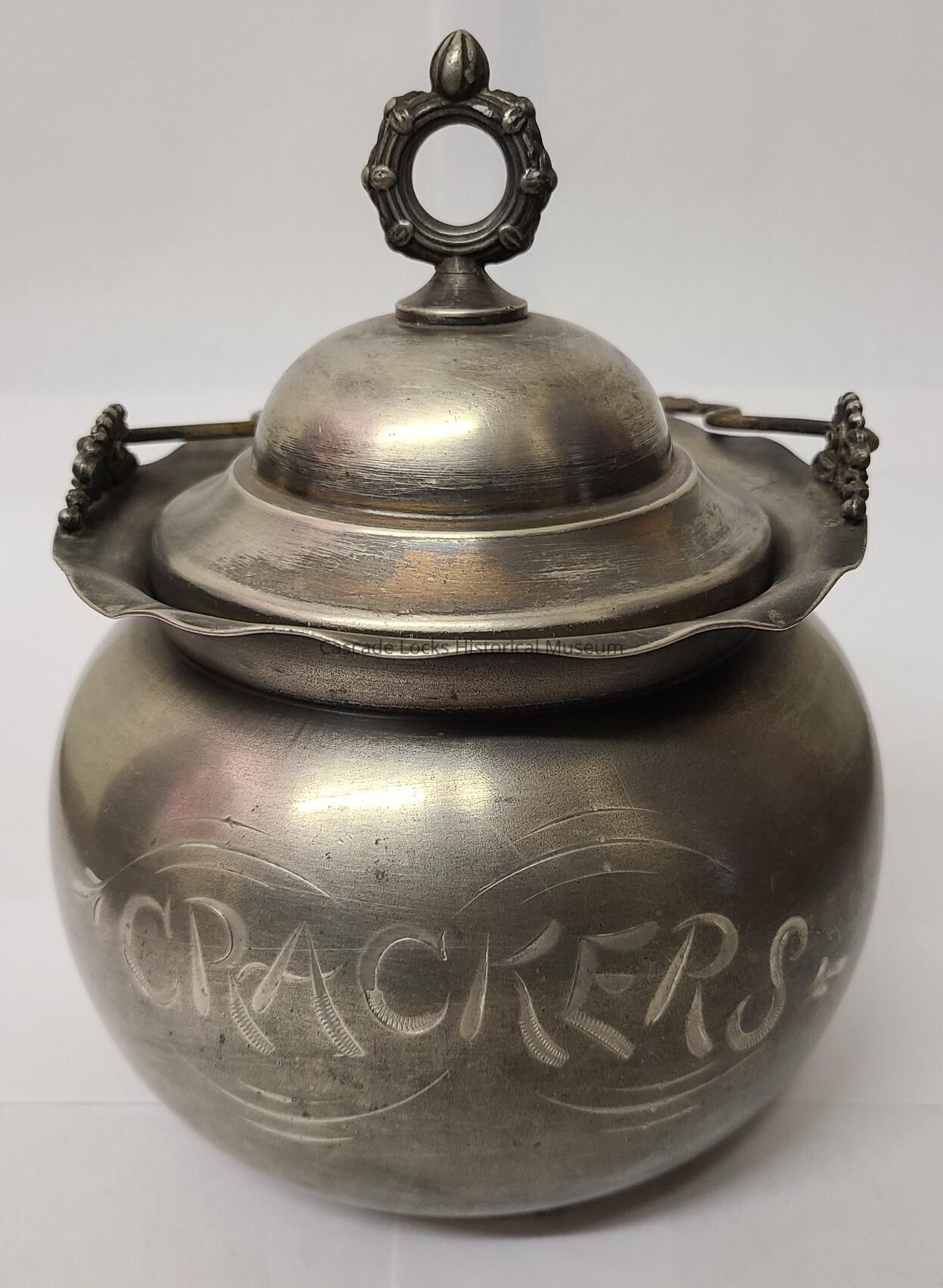Silver plated cracker jar with handle and removable lid. The jar, made by Rockford Silver Plate Company, is silver with the work "crackers" engraved in the front of the jar.