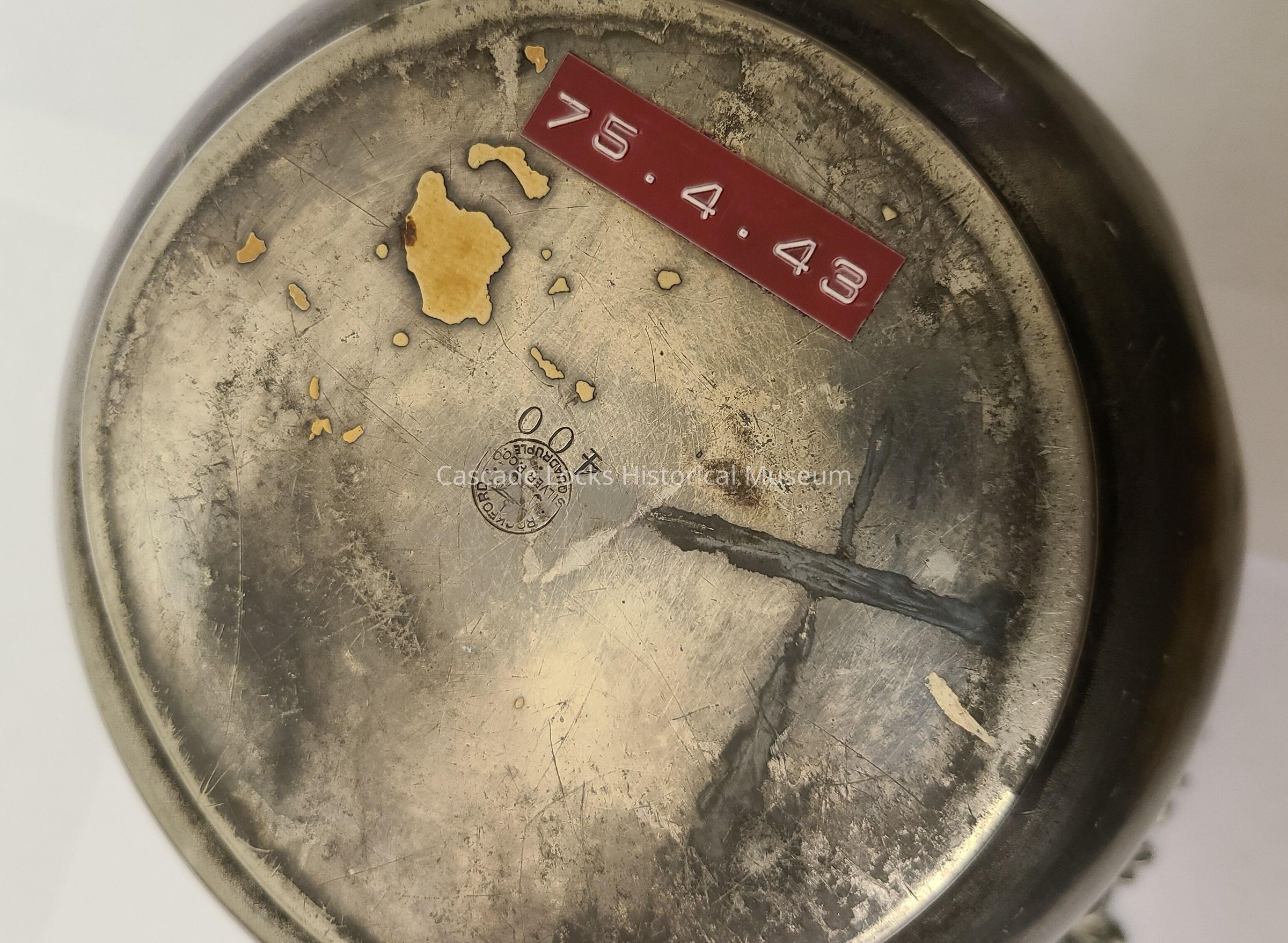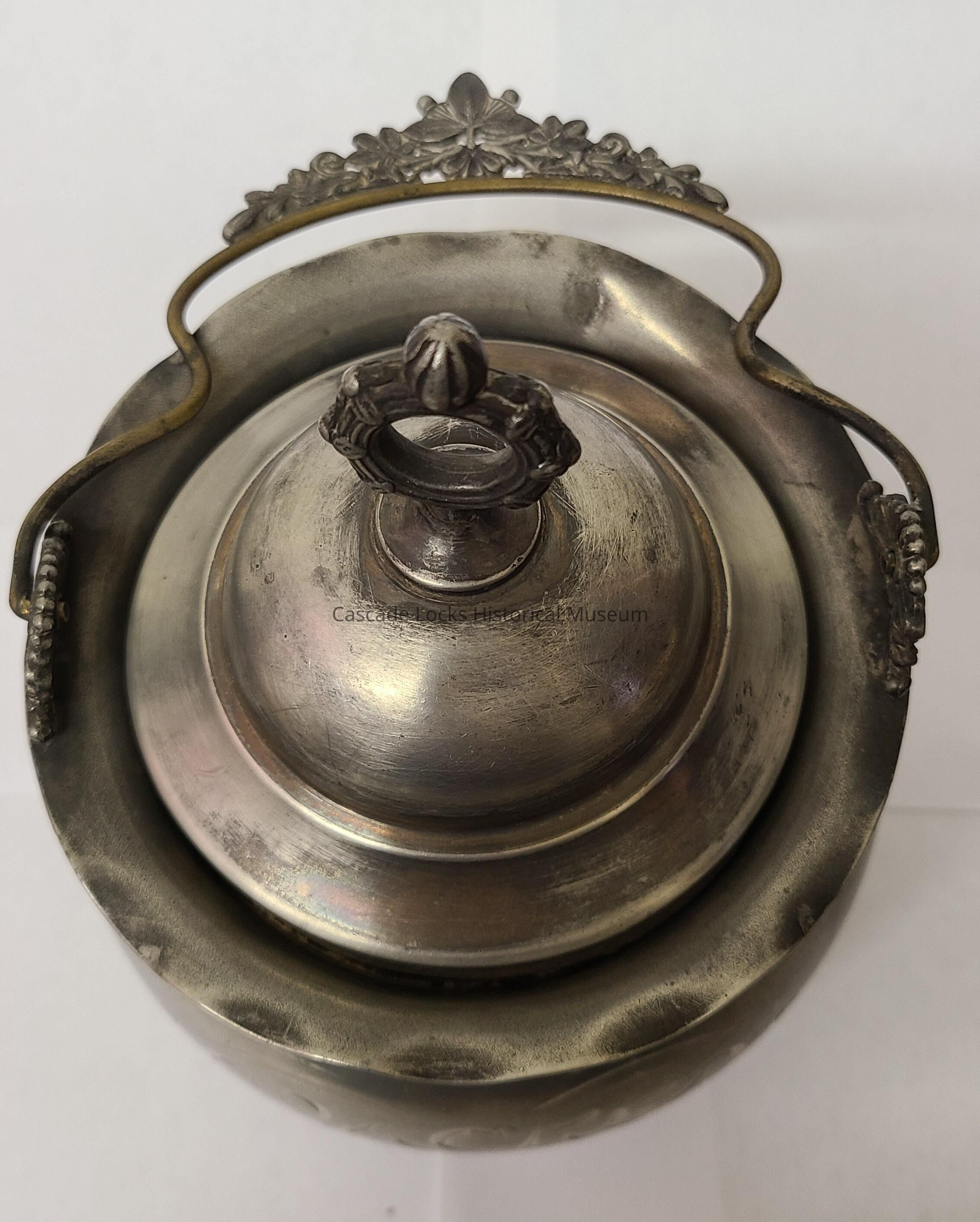 Silver plated jar in which the silver has been worn in areas exposing brass goldish colored metal and other darker metals underneath. Aslo the metal is tarnished creating more of a gray effect. There are areas of white oxidation.