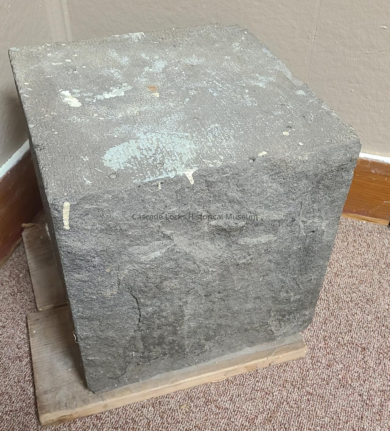 Stone block used in the construction of the Cascade Locks and Canal. Stone is square and has been shaped by stone masons during construction. One side of the stone is the naturally rough surface.