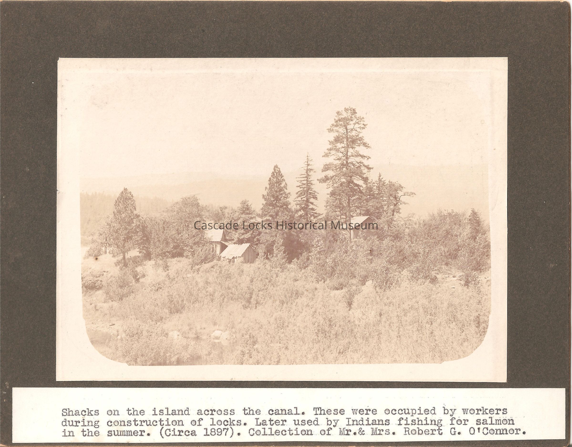 Back of image reads; "Shacks on the island across the canal. These were occupied by workers during the construction of the locks. Later used by Indians fishing for Salmon in the river. (Circa 1897). Collection of Mr. and Mrs. Robert G. O'Connor."