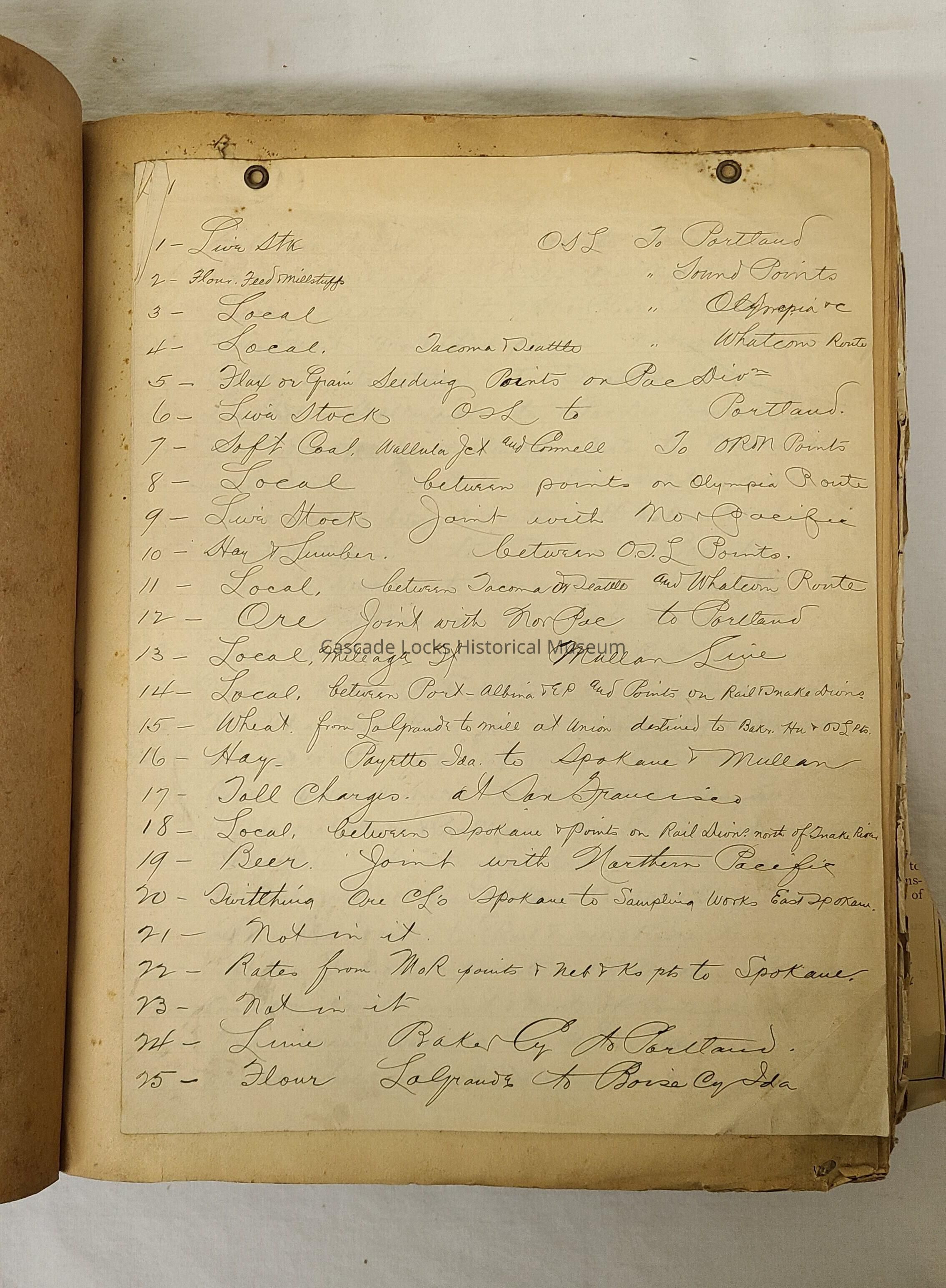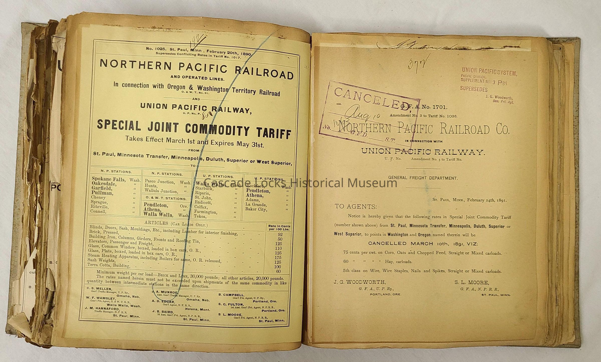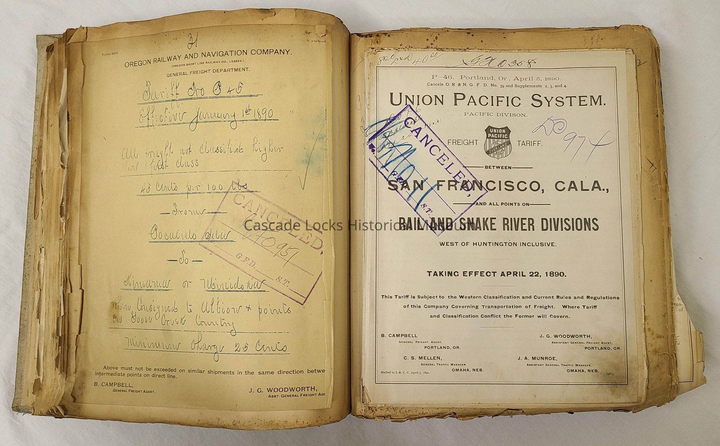 Book containing a log of glued in tariffs. When a tariff was issued it would be glued into the book in the order it was received as a way to keep record. After the tariff was expired or canceled it would be stamped or written on as confirmation.