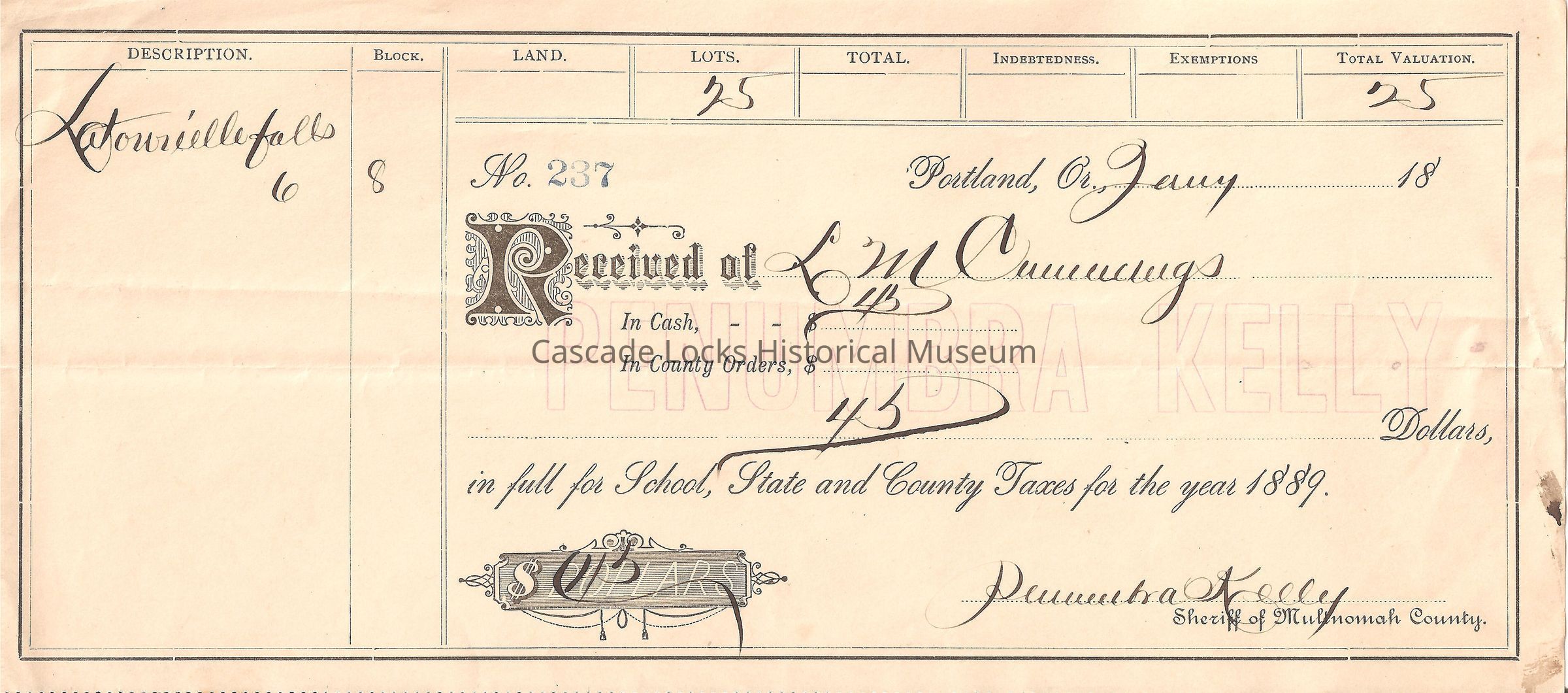 Received of L. M. Cummings. In Cash _. $45/ In County Orders, $_. 45/ Dollars. In full for School, State and County. Taxes for the year 1889. $45/ Signed (eligible) Kelly, Sherriff of Multnomah County. Description Latourell Falls 6, Block 8, Land, Lots 25, Total, Indebtedness, Exemptions, Total Valuation 25.