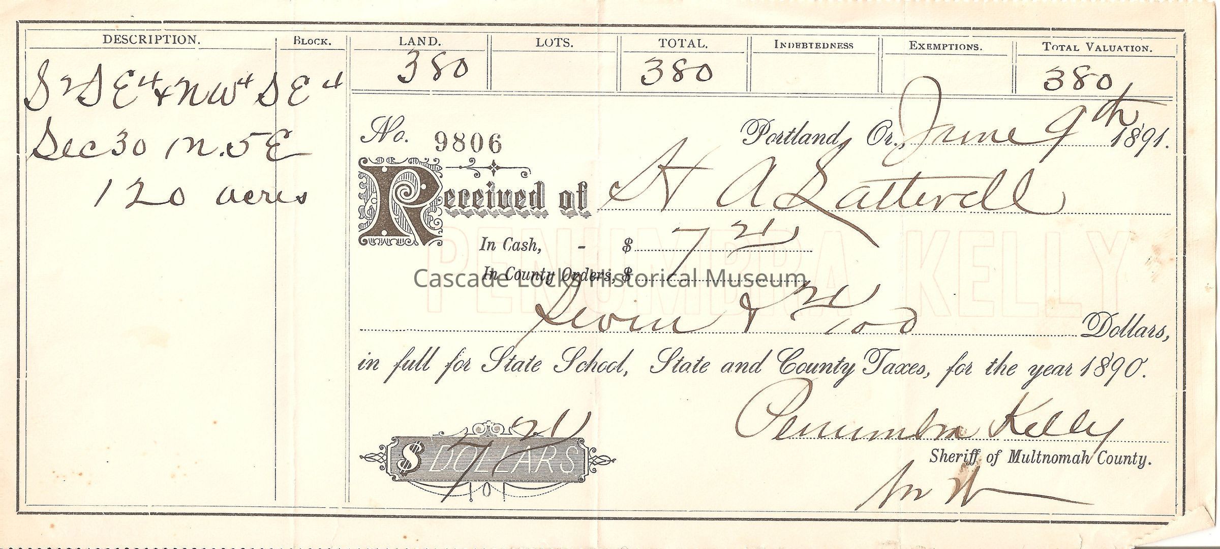 Received of H. A. Latourell. In Cash $7.21. In County Orders, $. Seven & 21/100 Dollars. in full for State School, State and County Taxes, for the year 1890. Signed Penumbra Kelly, Sherriff of Multnomah County. Signed (eligible) $7.21. Description S2SE4 + NW4SE4. Sec 30 1N 5E, 120 Acres, Land 380, Lots, Total 380, Indebtedness, Exemptions, Total Valuation 380.