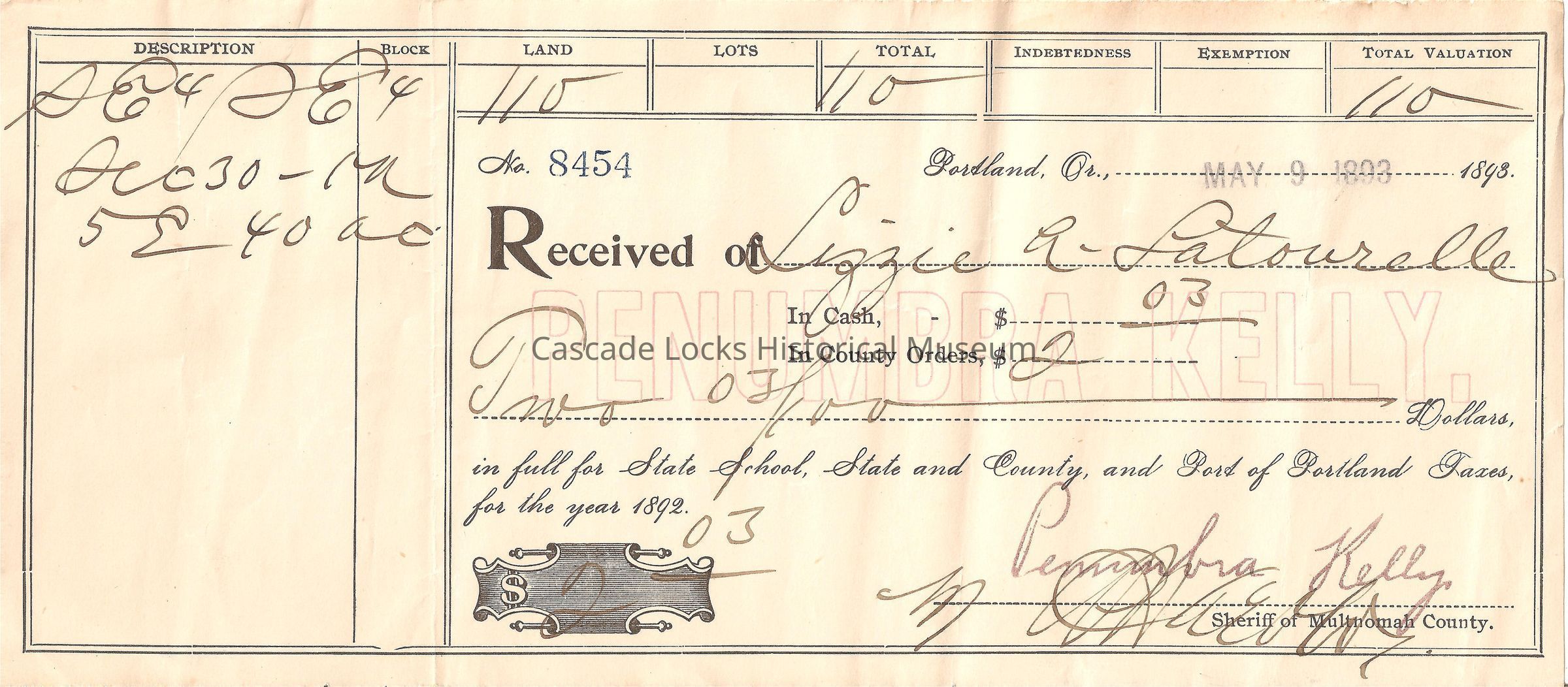 Received of Lizzie Latourell. In Cash, $2.03. In County Orders, $ Two & 03/100 Dollars, in full for state School, State and County, and Port of Portland Taxes, for the year 1892. $2.03. Penumbra Kelly, Sherriff of Multnomah County. Signed (eligible). Description SE4SE4 Sec 30 -1N 5E 40 Ac. Land 110, Lots, Total 110, Indebtedness, Exemption, Total 110.