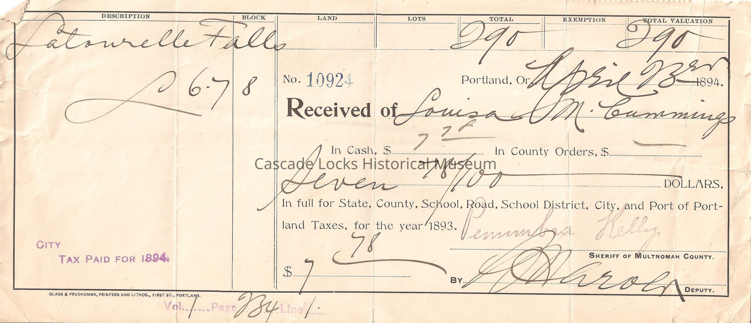 In Cash $7.78 In County Orders $ Seven $ 78/100 Dollars. In full for State, County, School, Road, School District, City, and Port of Portland Taxes, for the year 1893. $7.78. Signed Penumbra Kelly, Sherriff of Multnomah County. Signed by (eligible). Description Latourell Falls L 6.7, Block 8, Land, Lots, Total 290, Exemption, Total Valuation 290. Stamped City Tax for 1894. Vol 1 Page 234 Line 1.