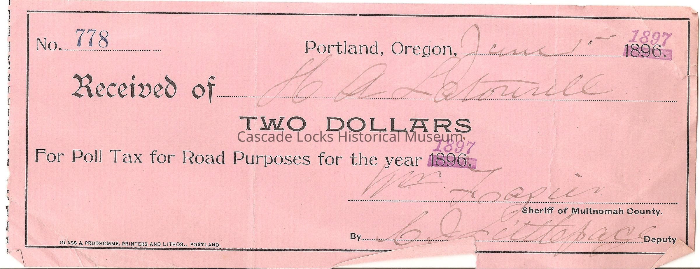 Two Dollars for Poll Tax for Road Purposes for the year 1897. Signed Wm. Foapin, Sherriff of Multnomah County. Signed by C. J. Littlepage Deputy.