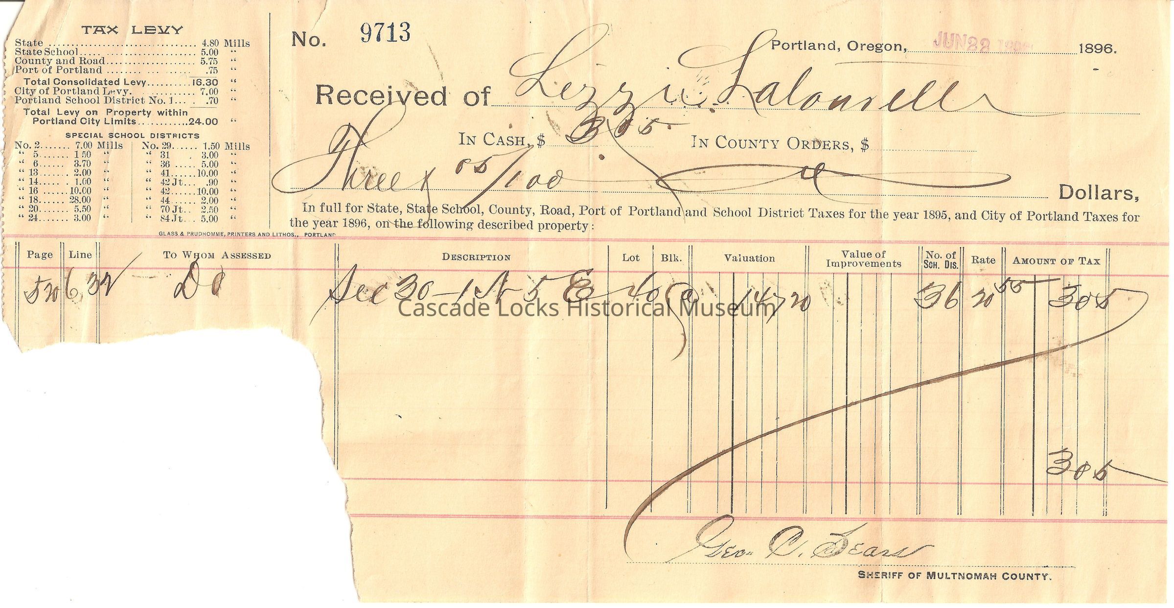 In Cash $3.05. In County Orders $__, Three and 05/100 Dollars. In full for State, County, County School, Road, Port of Portland and School District Taxes for the year 1895, and the City of Portland Taxes for the year 1896 on the following described property.