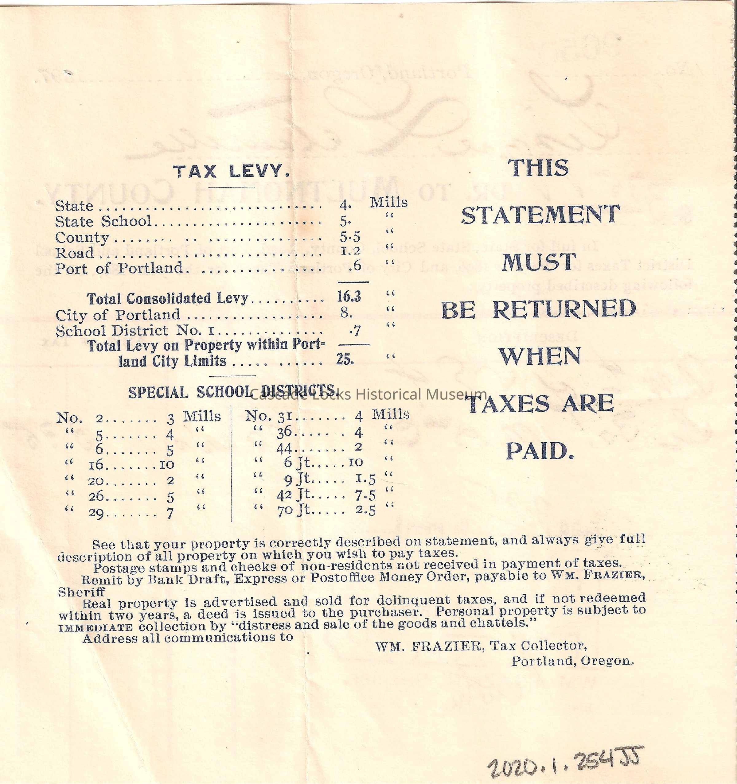 Back of document has; Tax Levies, Special School Levies, Special City Levies, Distribution of Taxes, Valuation of Property, Definition of terms and meanings.