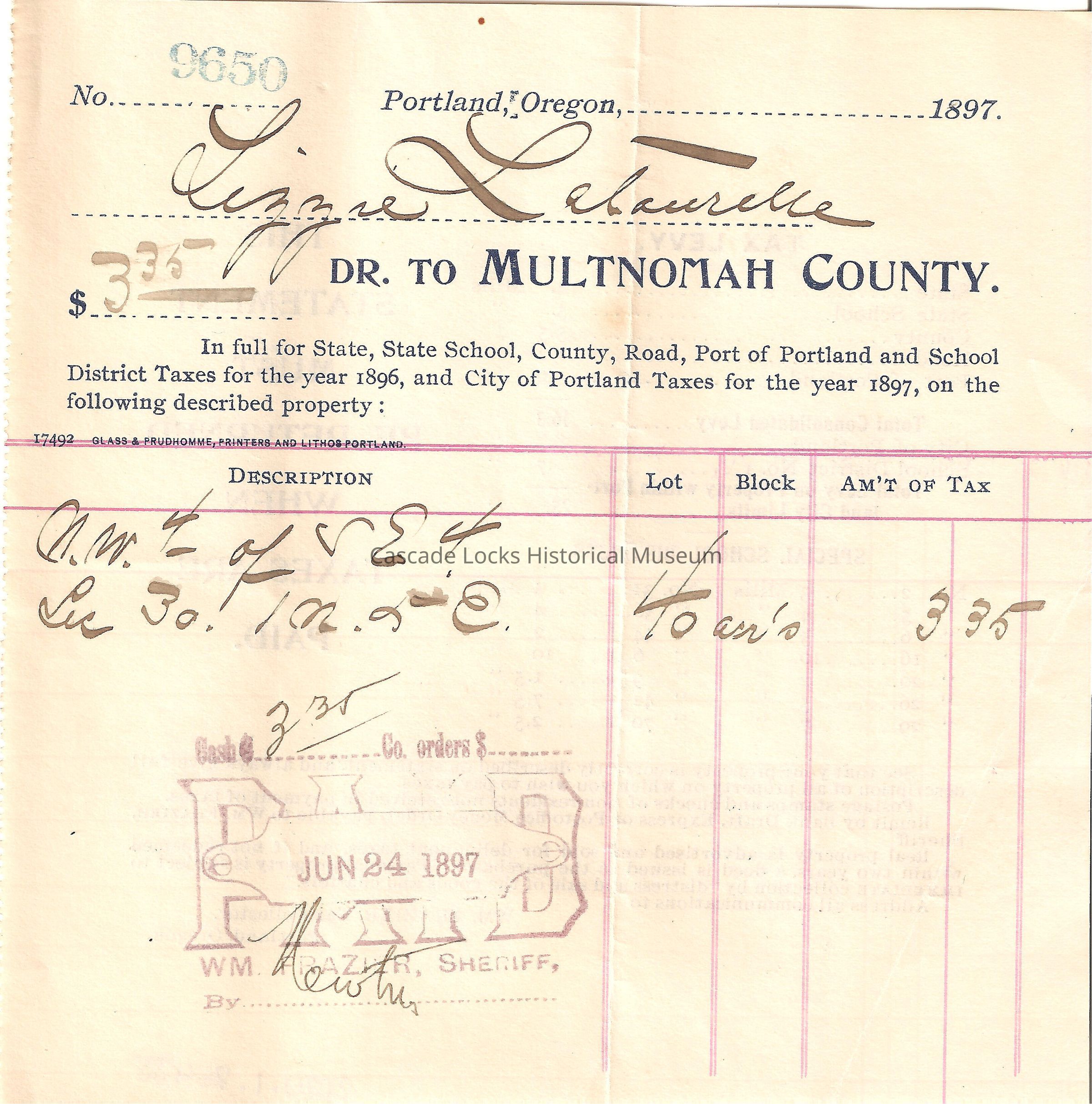 Dr. to Multnomah County. In full for State, County, County School, Road, Port of Portland and School District Taxes for the year 1896, and the City of Portland Taxes for the year 1897 on the following described property.