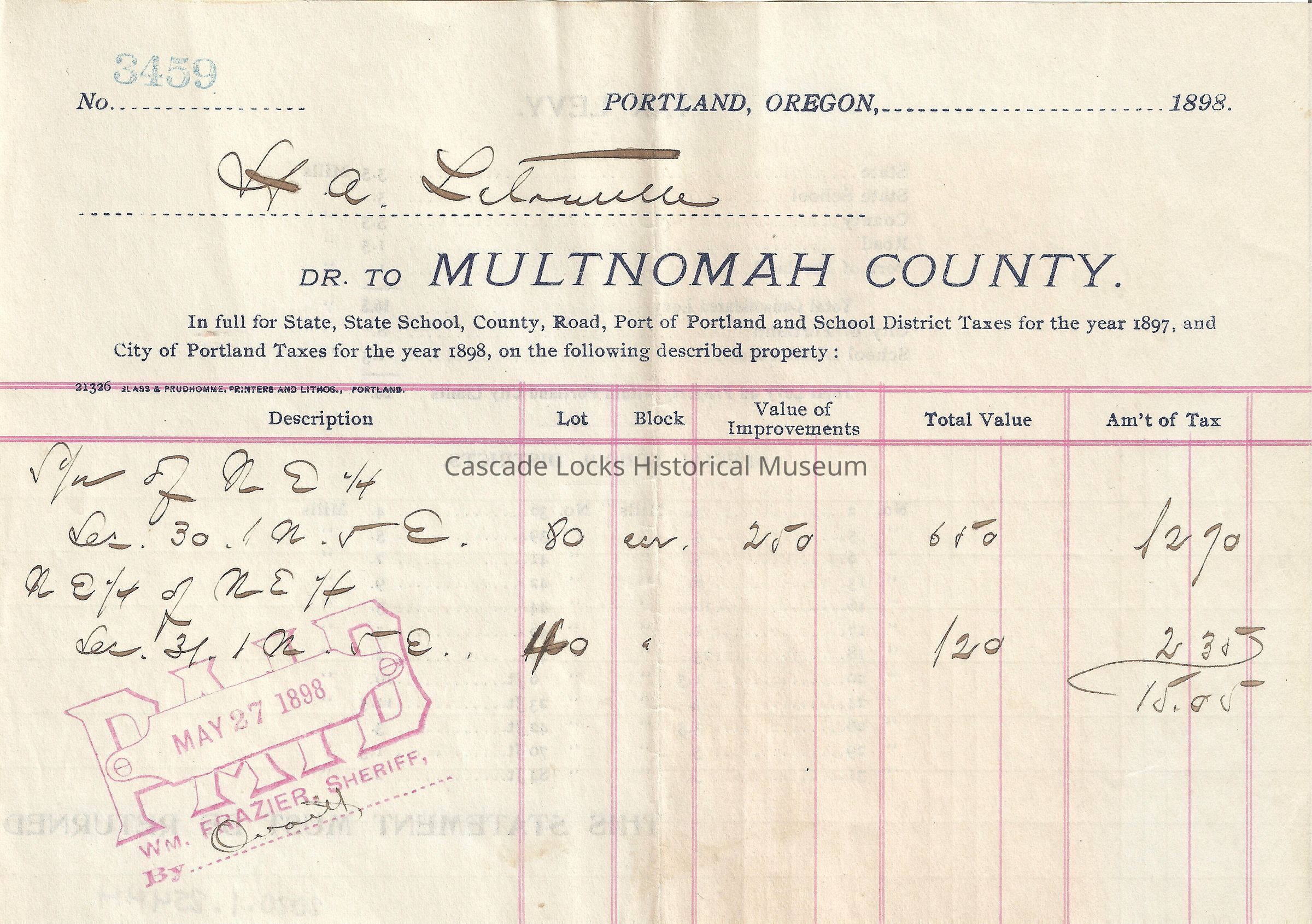Dr. to Multnomah County. For State, County, County School, Road, Port of Portland and School District Taxes for the year 1897 and the City of Portland Taxes for the year 1898 on the following described property. 51991 The Irwin- Hodson Co., Portland, Or.