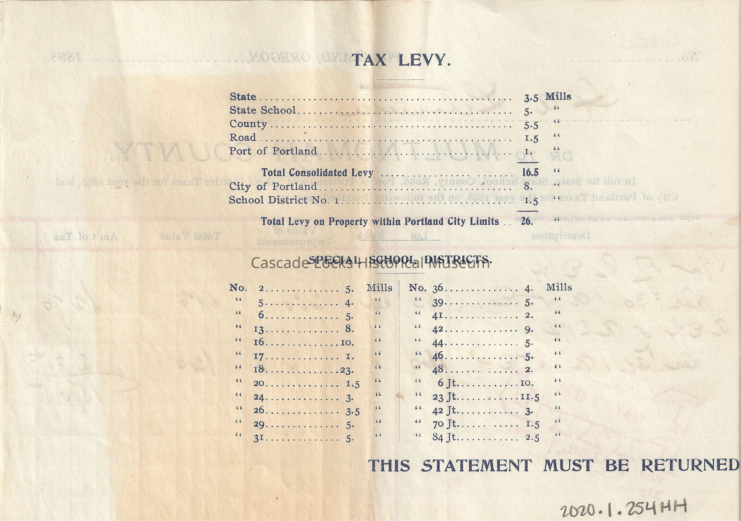 Back of document has; Tax Levies, Special School Levies, Special City Levies, Distribution of Taxes, Valuation of Property, Definition of terms and meanings.
