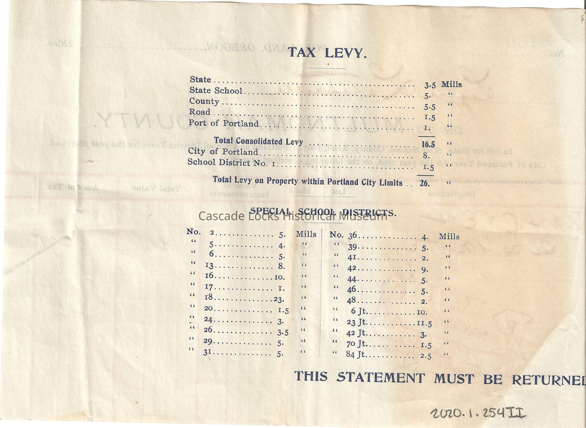 Back of document has; Tax Levies, Special School Levies, Special City Levies, Distribution of Taxes, Valuation of Property, Definition of terms and meanings.