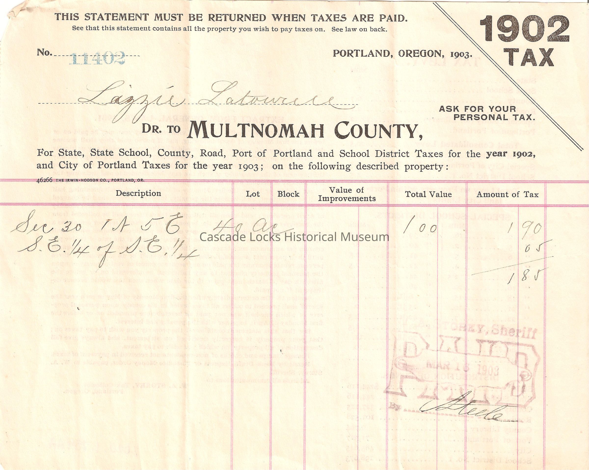 Taxes, 1902, LatourellEntry/Object ID