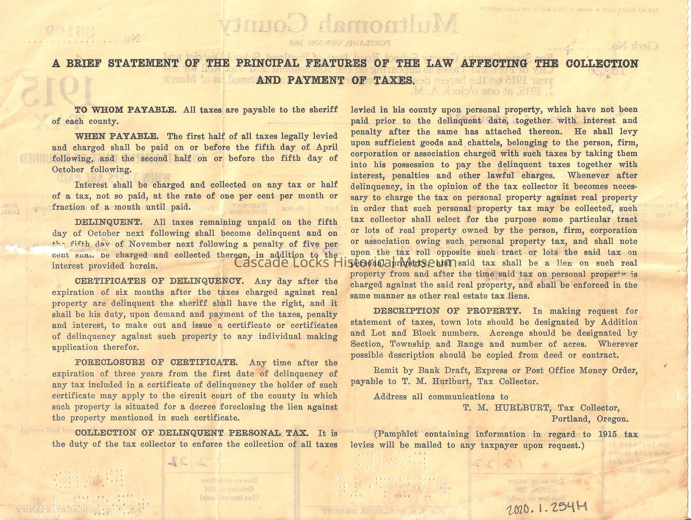 1915 TAXES, Multnomah County Portland, Oregon, 1916. Statement of all State, County, County School, Road, Port of Portland, School District, City of Portland and all other Taxes, as appearing on the Assessment and Tax Roll for the year 1915 on the herein described property, which was assessed as of March 1, 1915, at One O'clock A.M. This Statement and Duplicate must be with your remittance. No. 33169. Clerk No. 18328.