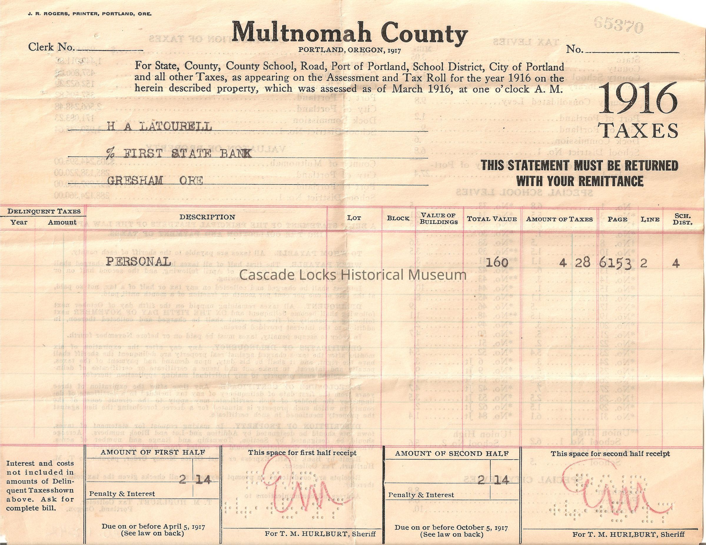 Amount of First Half 2.14, Penalty and Interest. Due on or before April 5, 1917 (See Law on Back) Space for first half receipt Paid 4-5-17. For T. M. Hurlburt, Sherriff. Amount of Second Half 2.14 Penalty and Interest Due on or before October 5, 1917. (See law on back) This space for Second Half Receipt Paid 4-5-17. For T. M. Hurlburt, Sherriff.