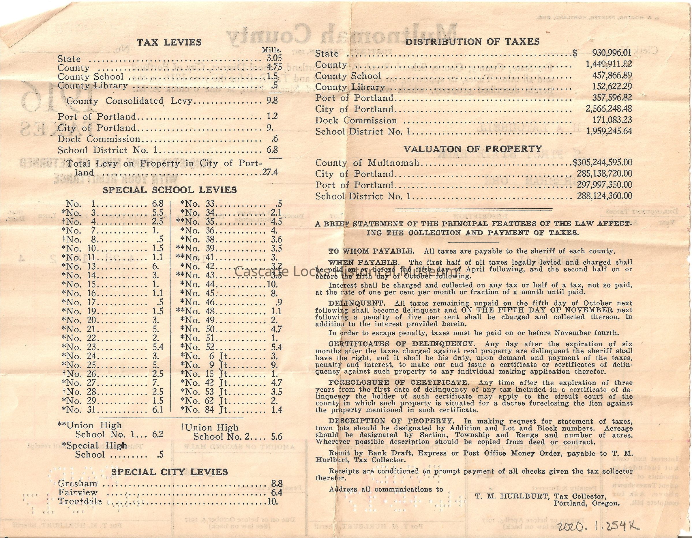 1916 TAXES, Multnomah County Portland, Oregon, 1917. Statement of all State, County, County School, Road, Port of Portland, School District, City of Portland and all other Taxes, as appearing on the Assessment and Tax Roll for the year 1916 on the herein described property, which was assessed as of March 1, 1916, at One O'clock A.M. This Statement and Duplicate must be with your remittance.
