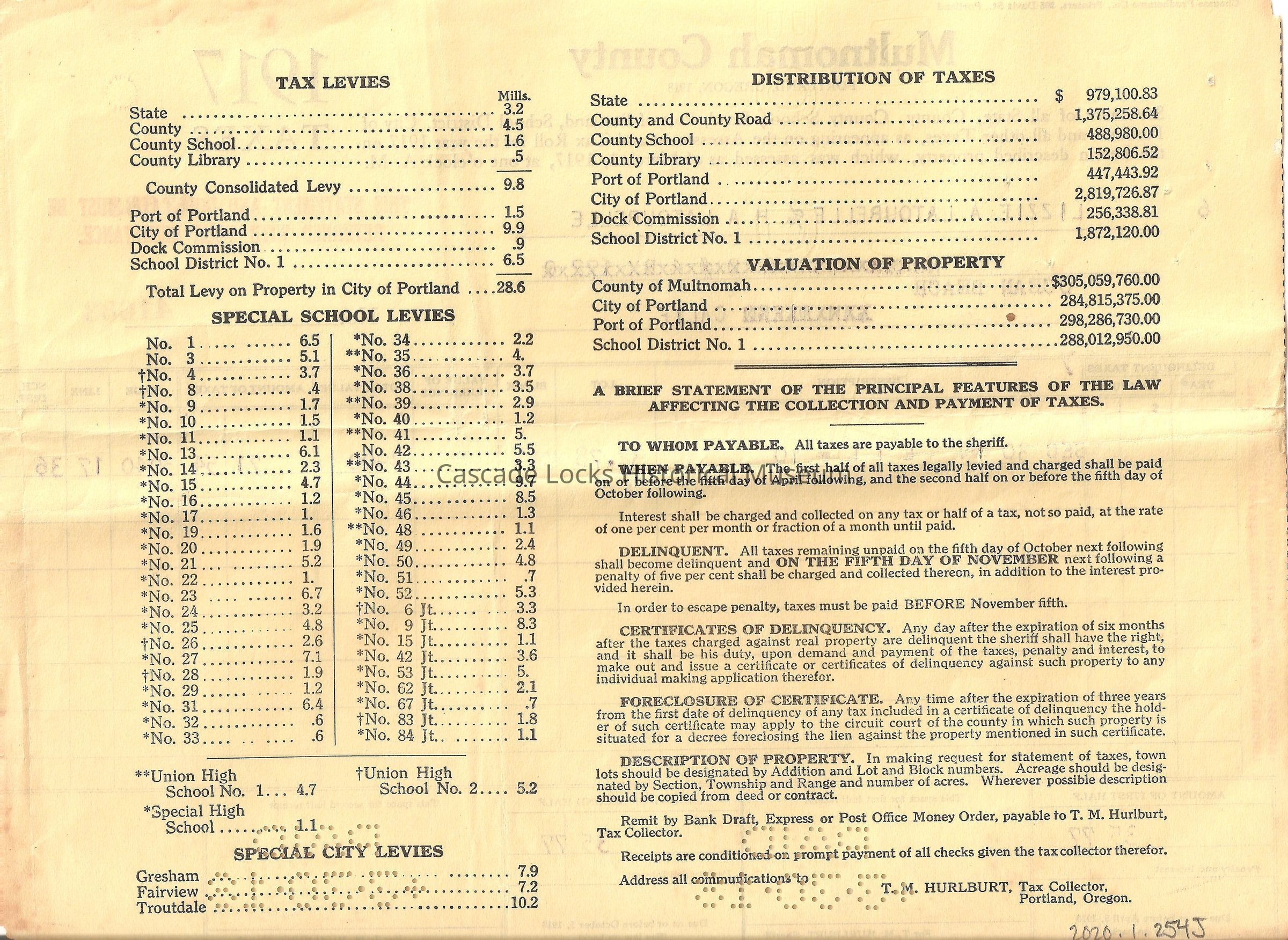 1917 TAXES, Multnomah County Portland, Oregon, 1918. Statement of all State, County, County School, Road, Port of Portland, School District, City of Portland and all other Taxes, as appearing on the Assessment and Tax Roll for the year 1917 on the herein described property, which was assessed as of March 1, 1917, at One O'clock A.M. This Statement and Duplicate must be with your remittance.