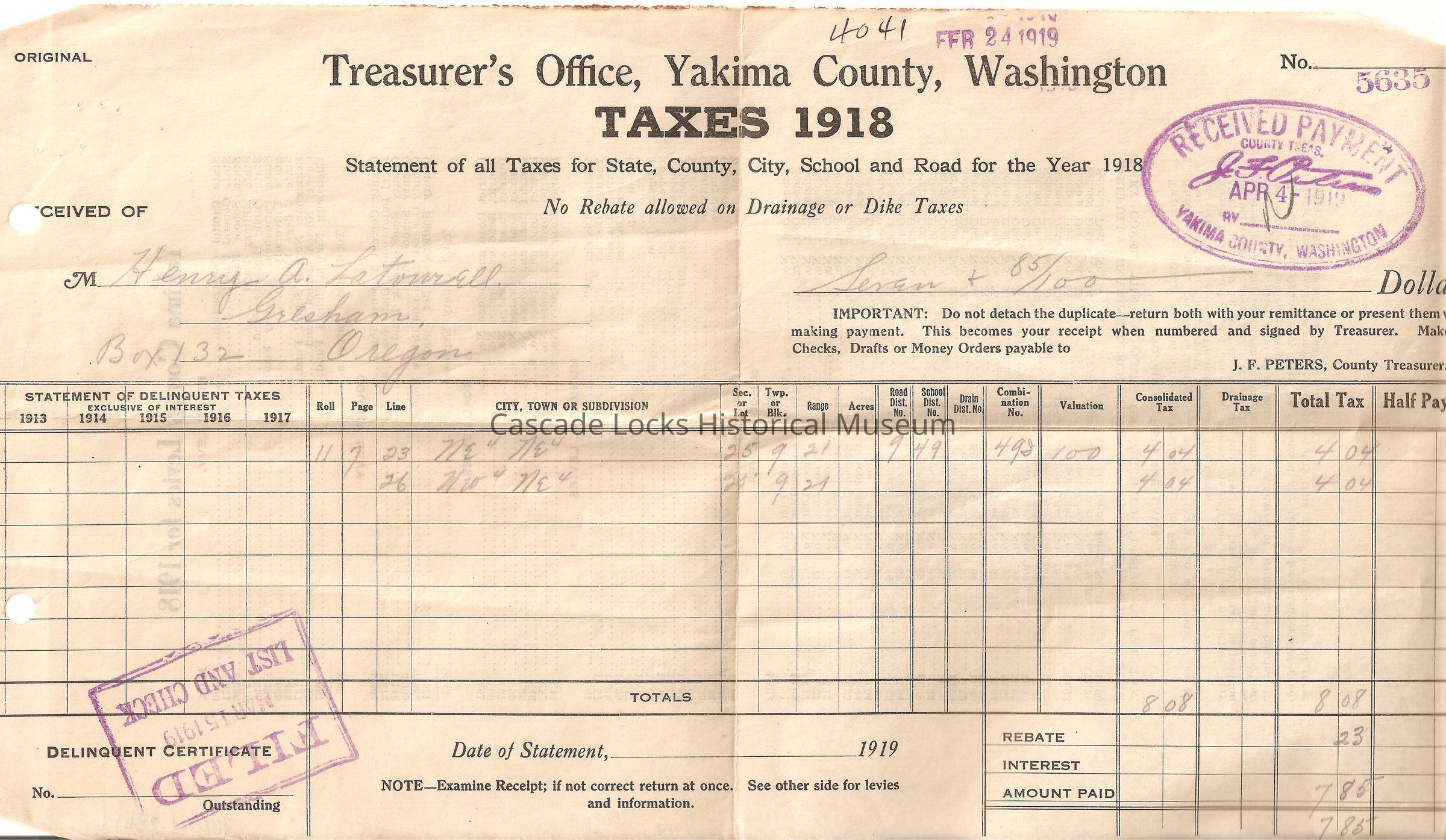 Treasurers Office Yakima County, Washington Taxes 1918. Statement of all Taxes for State, County, City, School and Road for the year 1918. No rebate allowed on drainage or dike Taxes. 4041 Feb 24th 1919. No. 5635. Received payment County Treas. J. F. -. APR 4 -1919 by- Yakima County, Washington.