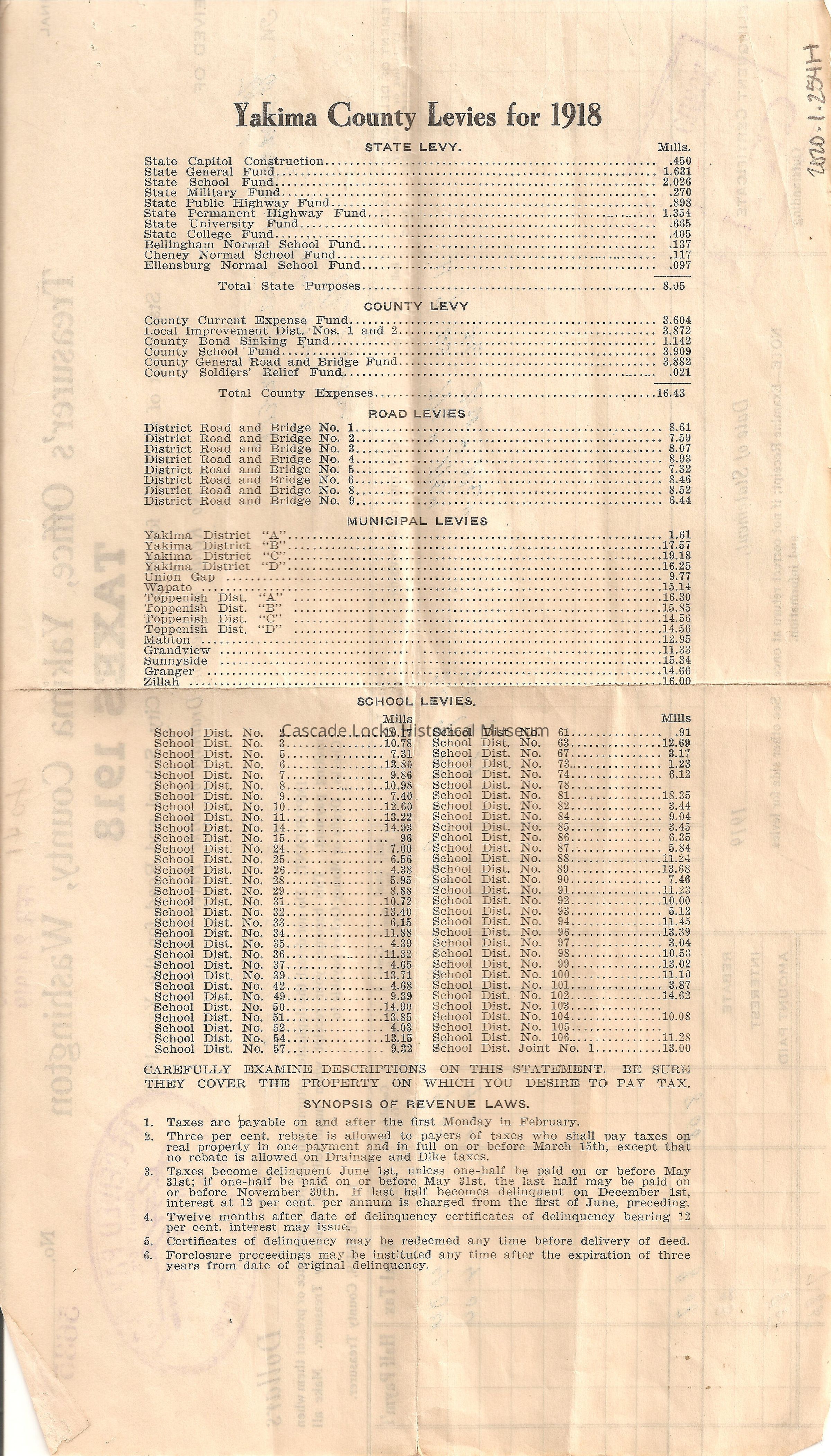 Back of tax forms has listed the Yakima County levies for the year 1918.Lexicon