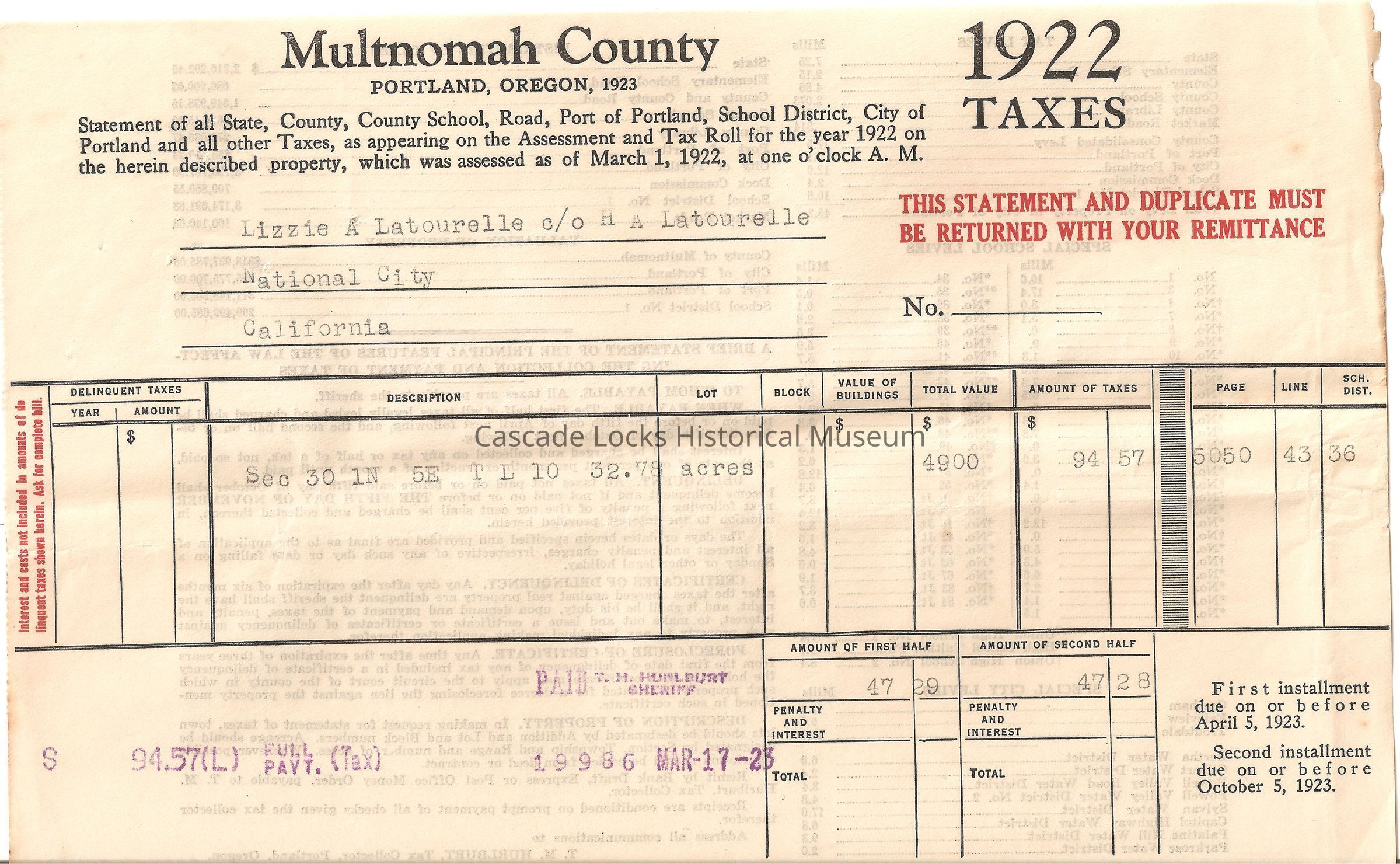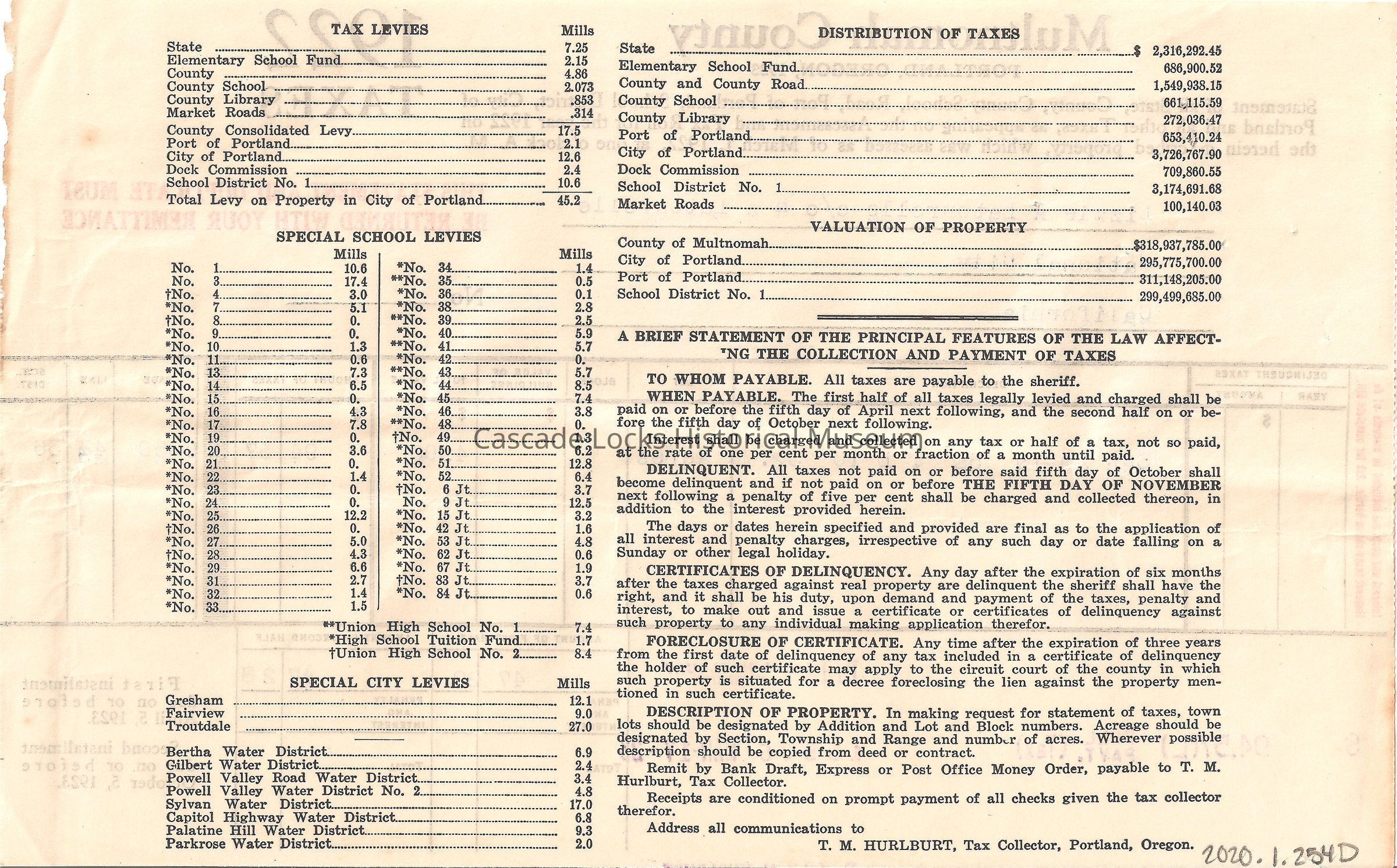 1922 TAXES, Multnomah County Portland, Oregon, 1923. Statement of all State, County, County School, Road, Port of Portland, School District, City of Portland and all other Taxes, as appearing on the Assessment and Tax Roll for the year 1922 on the herein described property, which was assessed as of March 1, 1922, at One O'clock A.M. This Statement and Duplicate must be returned with your remittance.