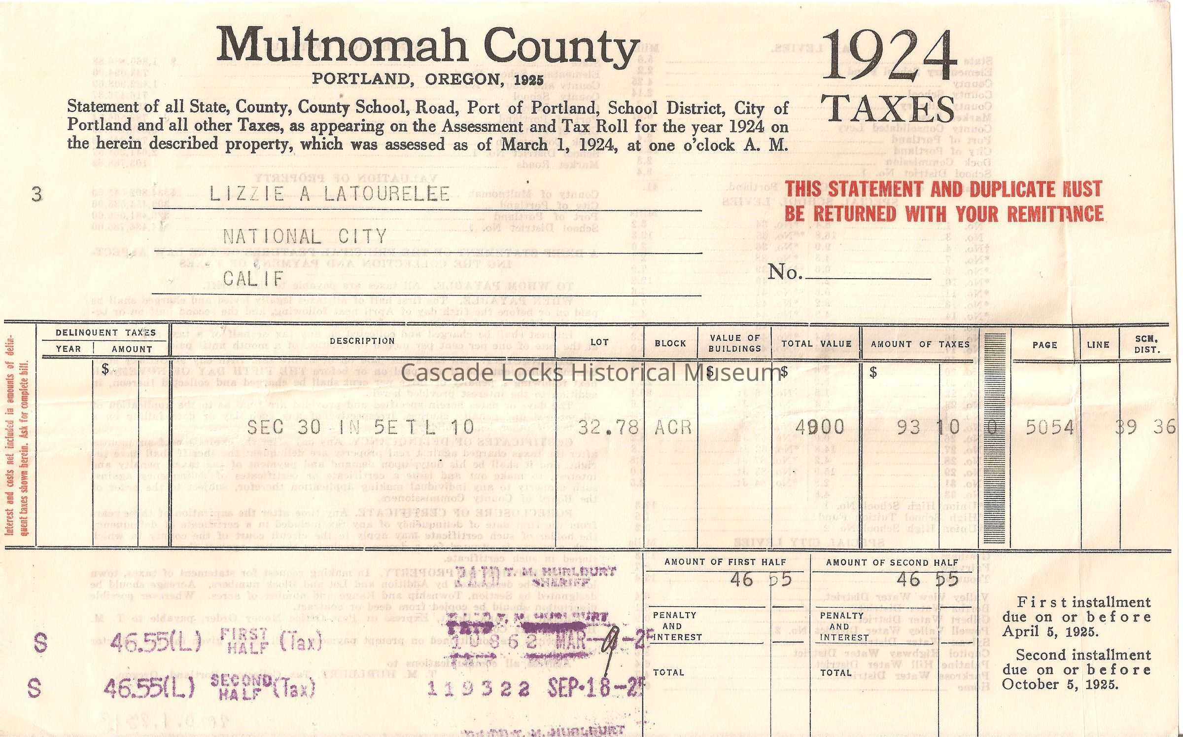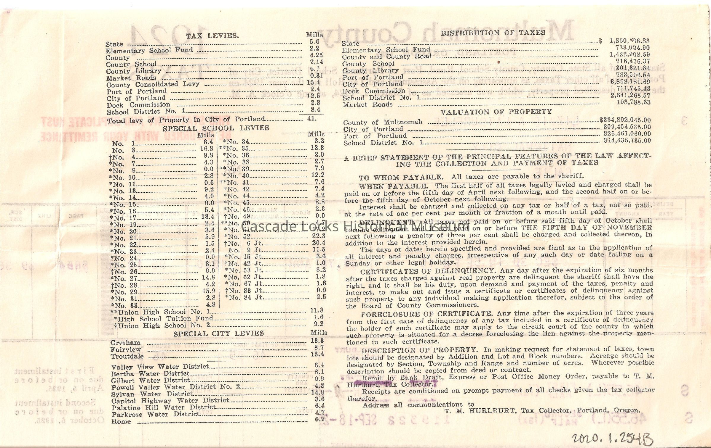 1924 TAXES, Multnomah County Portland, Oregon, 1924. Statement of all State, County, County School, Road, Port of Portland, School District, City of Portland and all other Taxes, as appearing on the Assessment and Tax Roll for the year 1924 on the herein described property, which was assessed as of March 1, 1924, at One O'clock A.M. This Statement and Duplicate must be returned with your remittance.