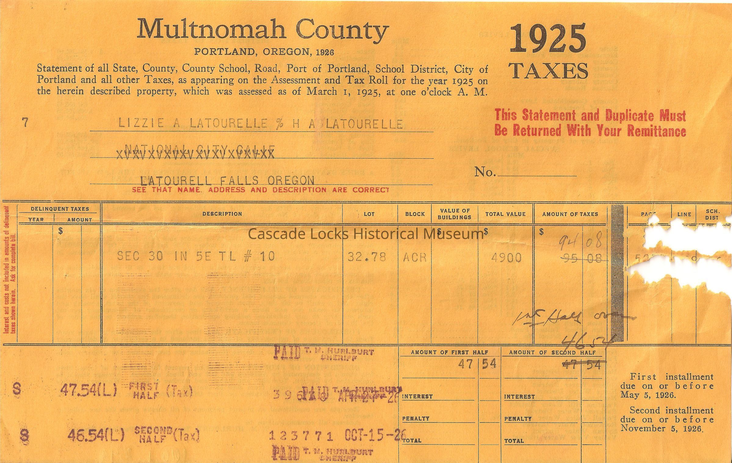 Lizzie A. Latourell % H. A. Latourell, -National City Calif-, Latourell Falls, Oregon. See that name, address and description are correct. Interest and costs not included in amounts or Delinquent taxes shown herein. Ask for complete bill.