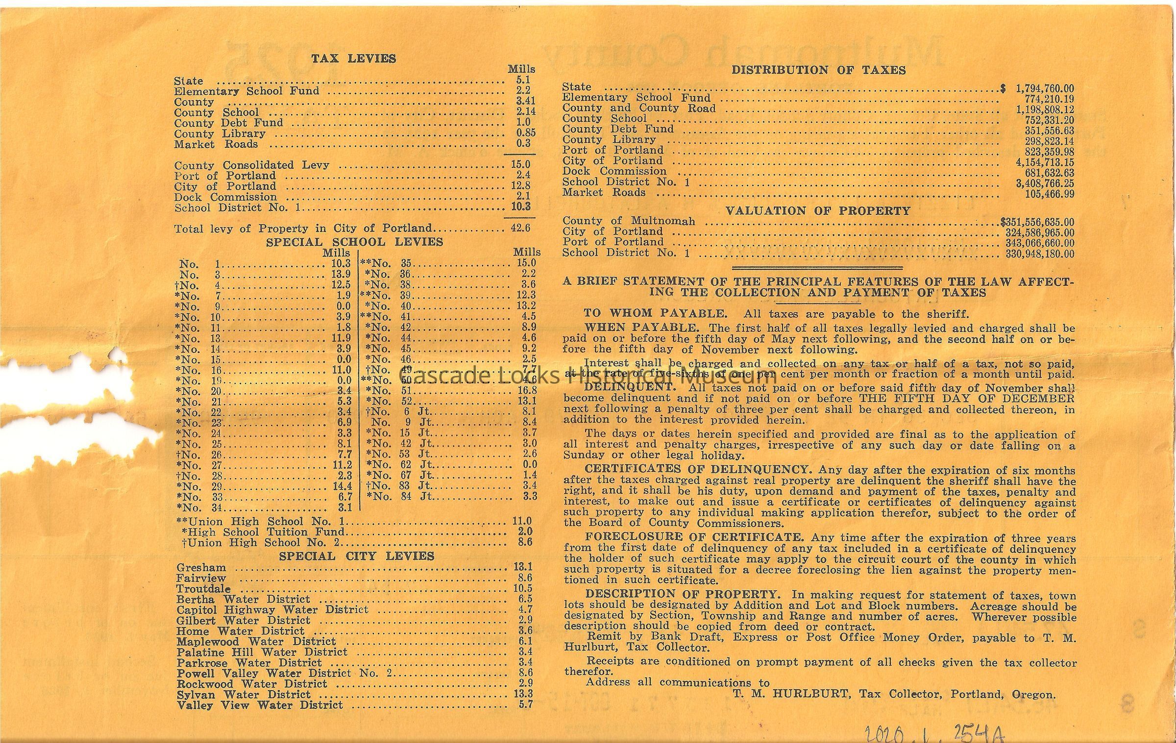 Back of document has; Tax Levies, Special School Levies, Special City Levies, Distribution of Taxes, Valuation of Property, Definition of terms and meanings.