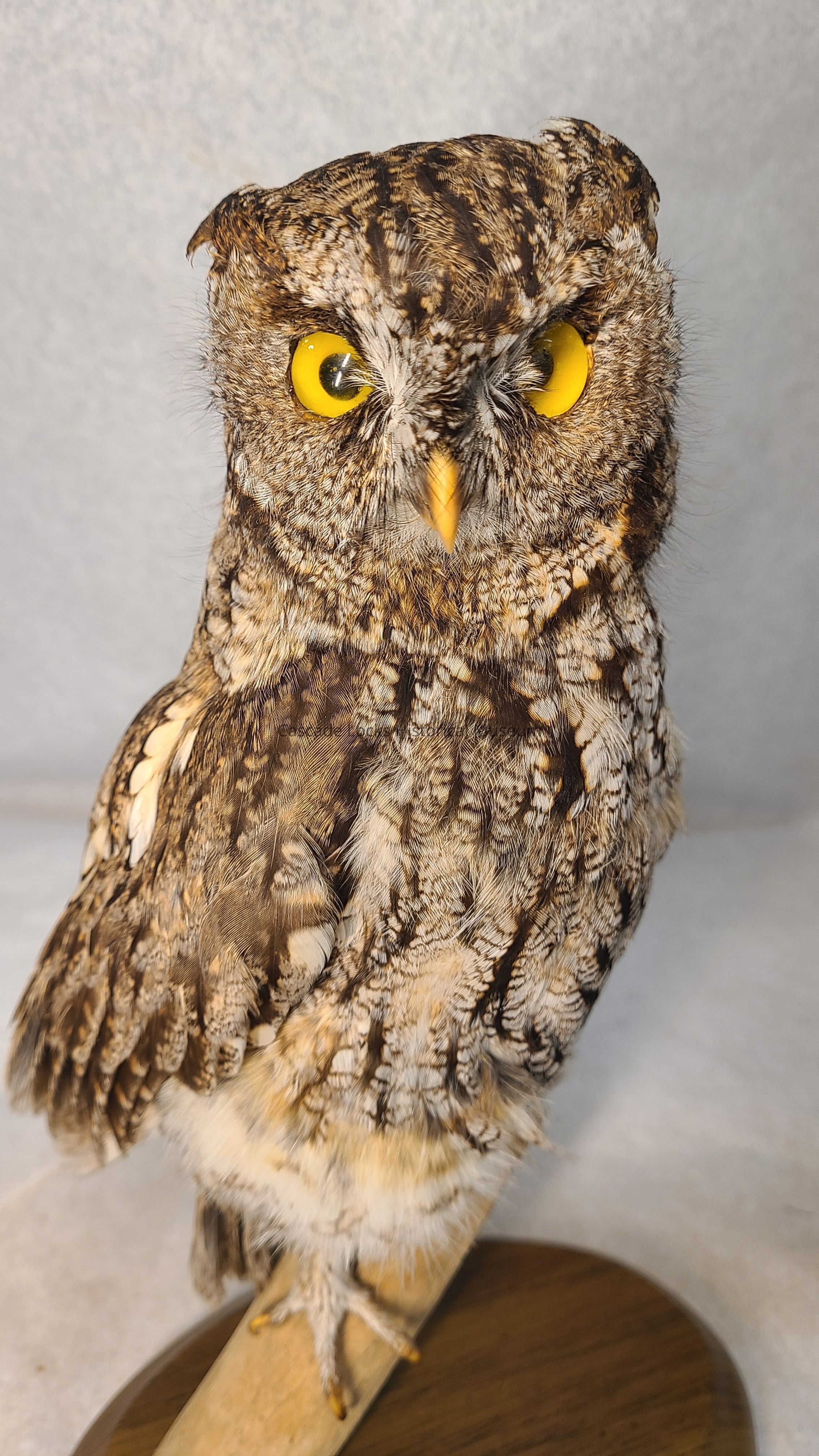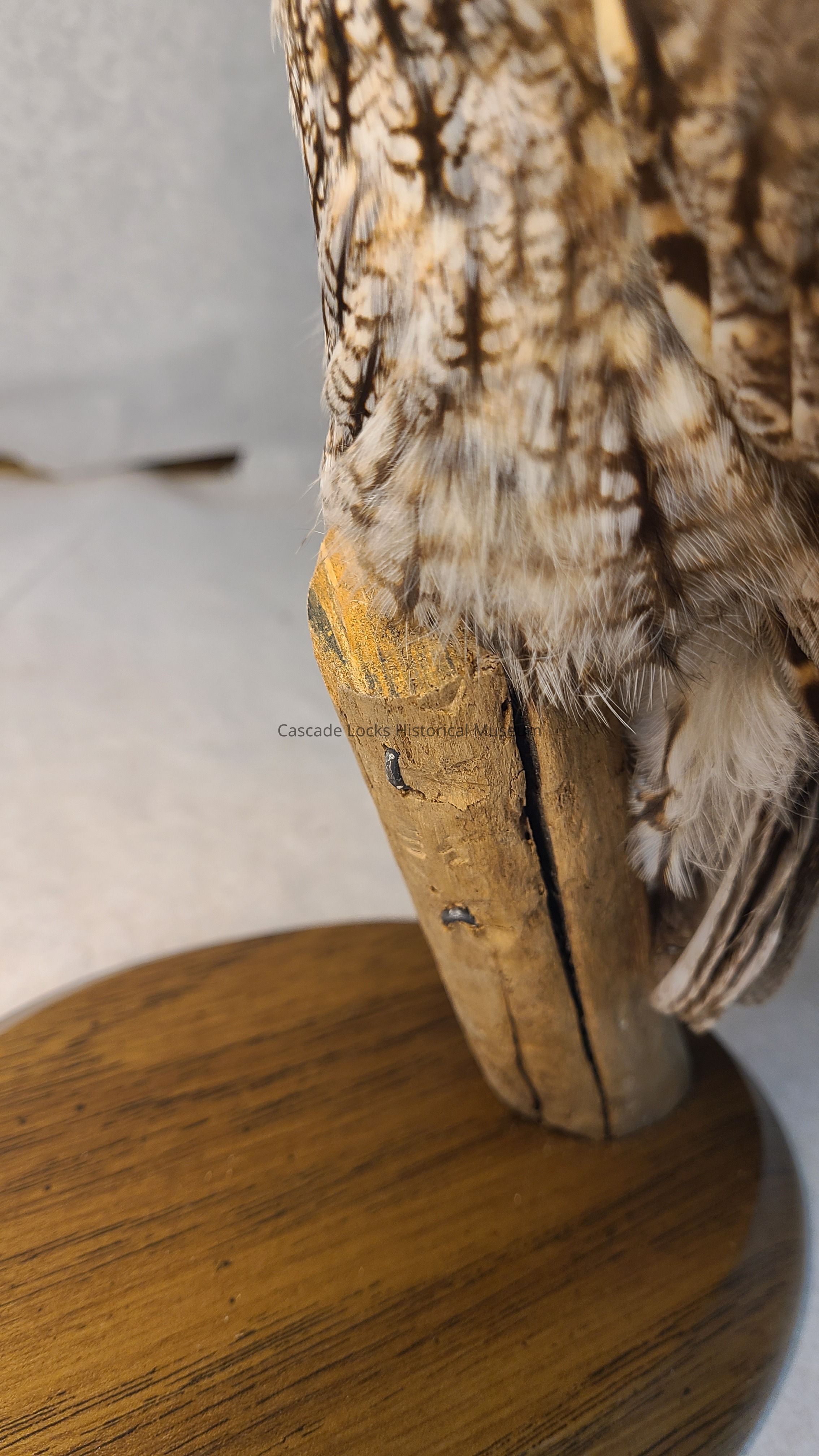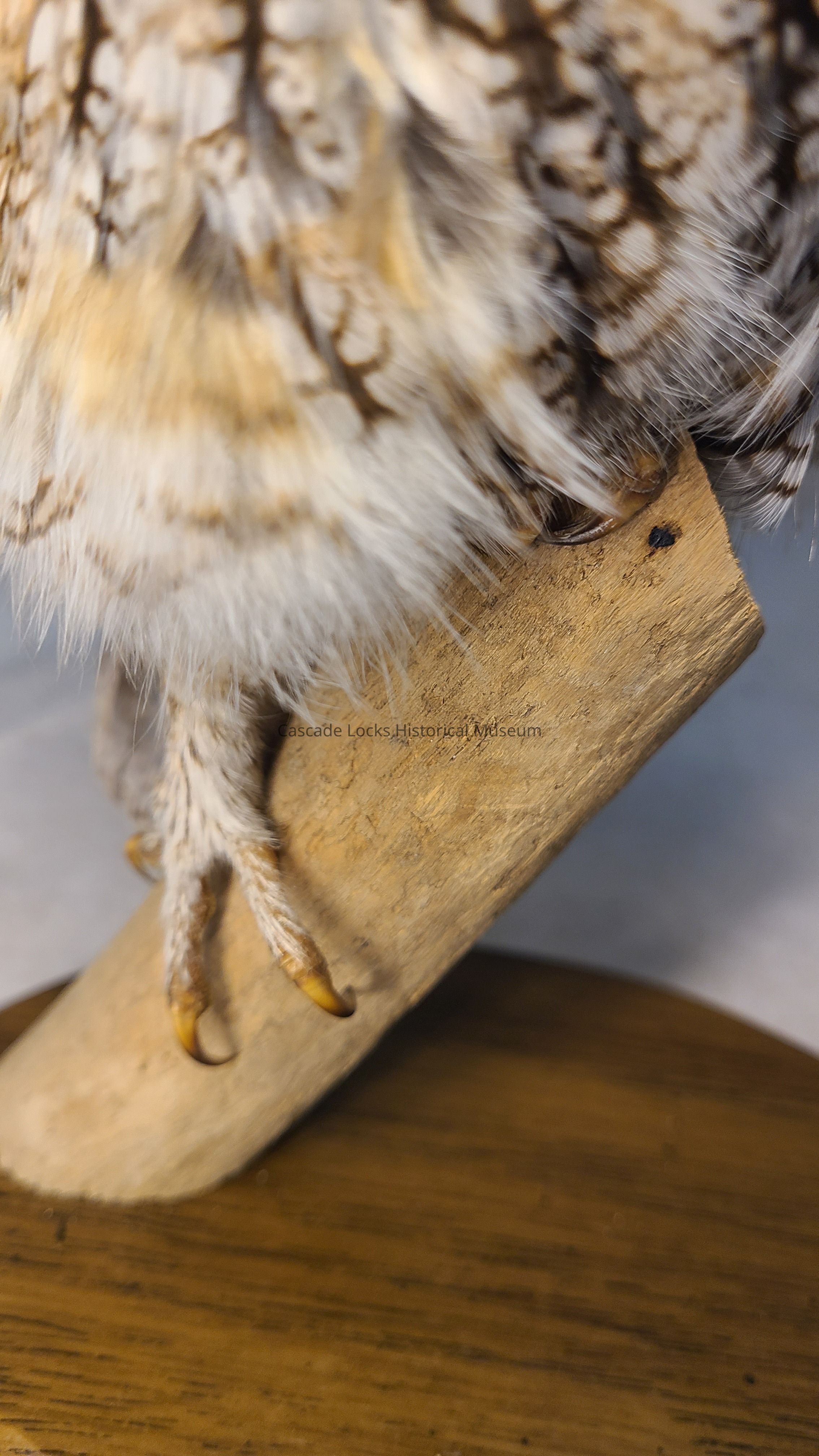 Taxidermy owl mounted onto a round wood dowel that is then mounted on to a oval wood plaque.