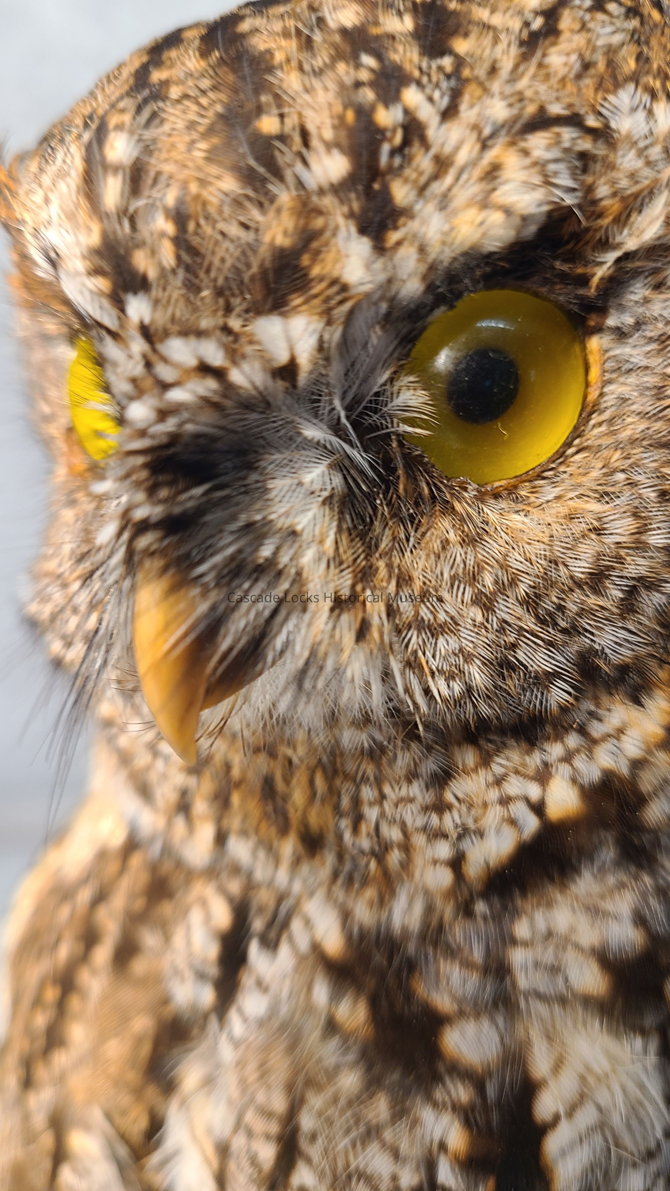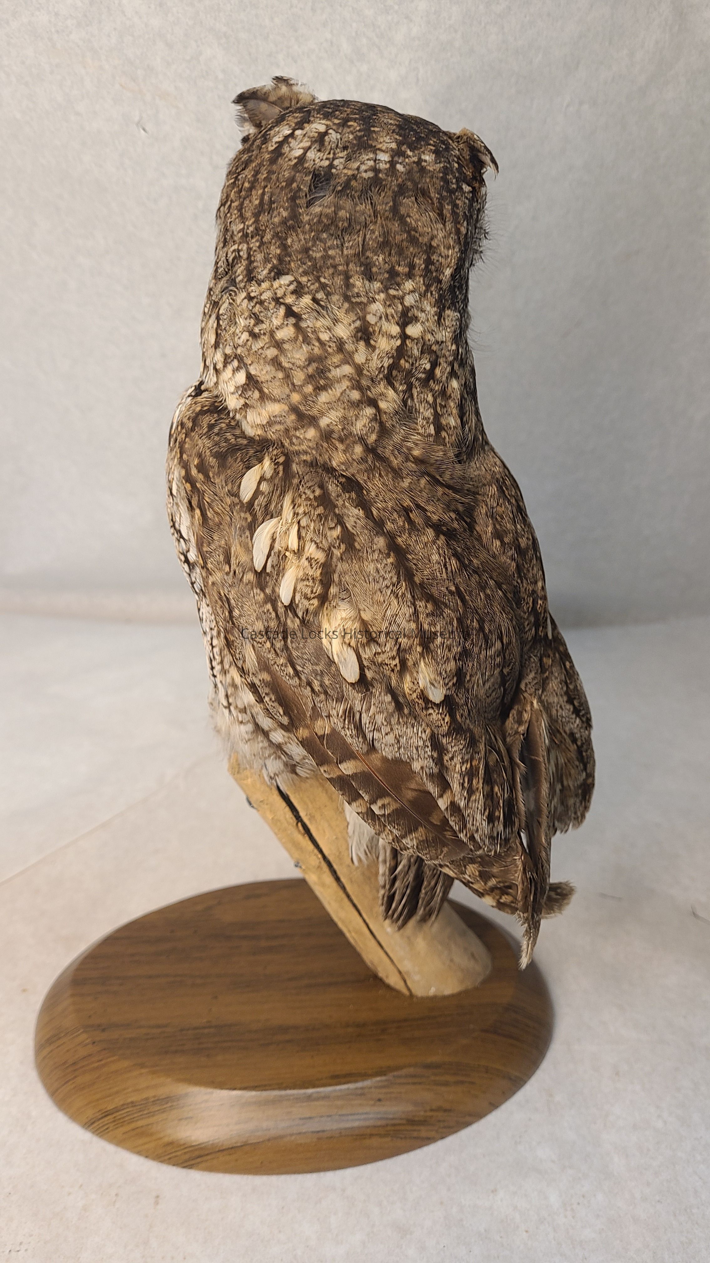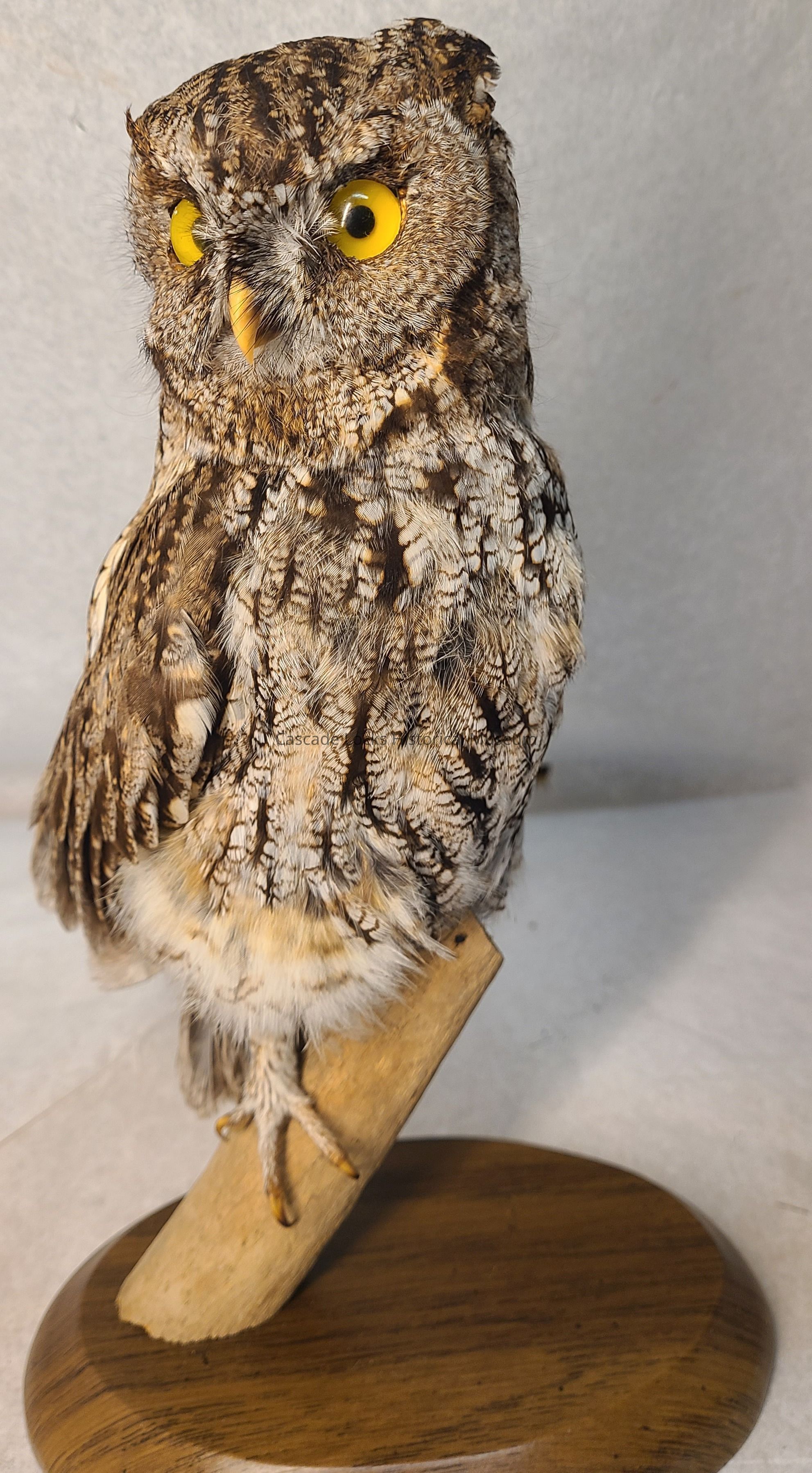 Taxidermy owl mounted onto a round wood dowel that is then mounted on to a oval wood plaque.