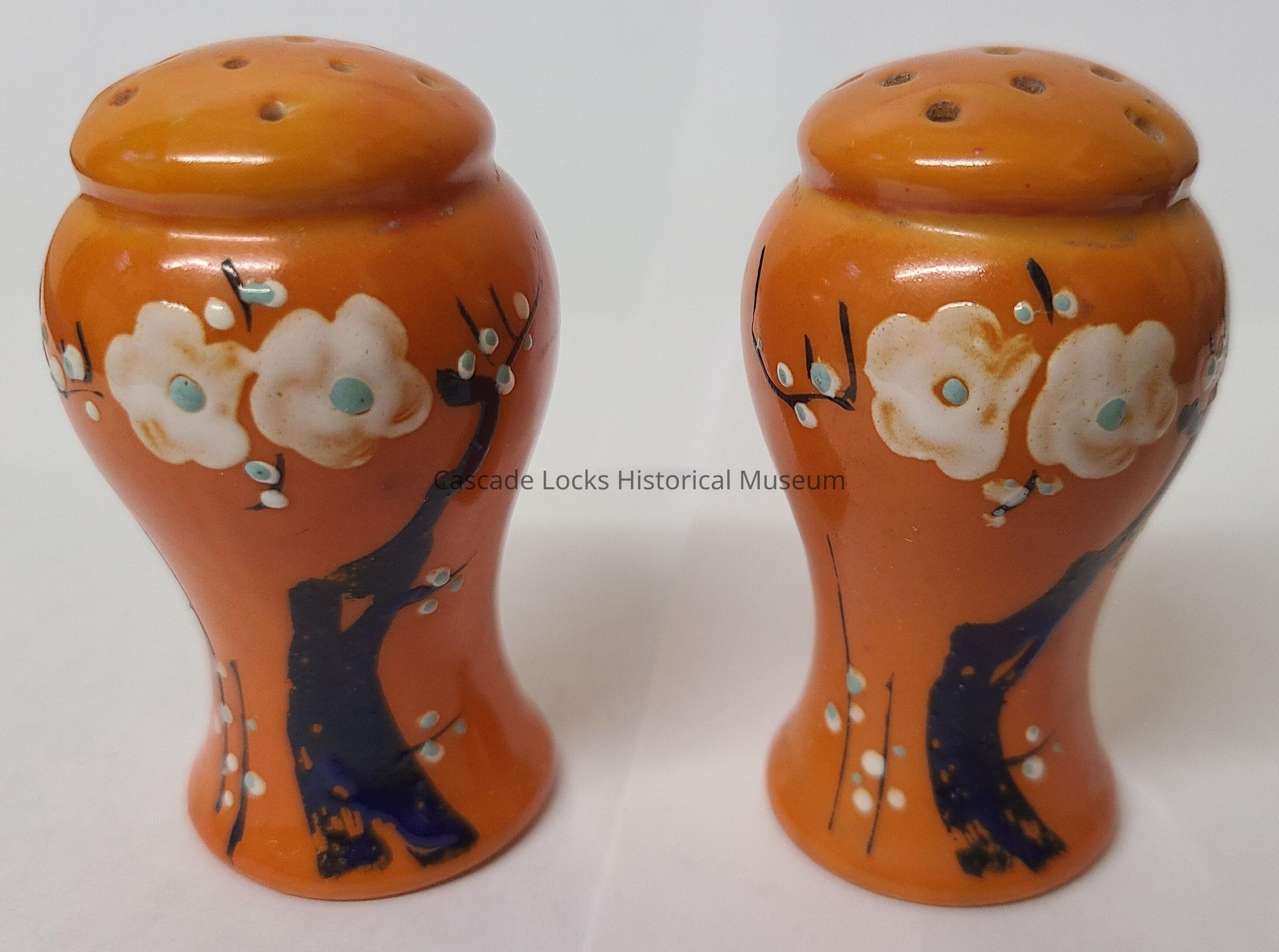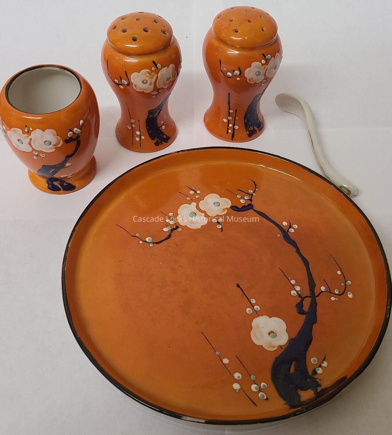 Orange glazed Japanese tea set with blue trees white flowers and teal accents. Items include one plate, two shakers (salt/pepper), one small spoon and one small open container possibly for sugar or cream. Bottom says, "Hand Painted Nippon, Made in Japan."Inscription/Signature/Marks