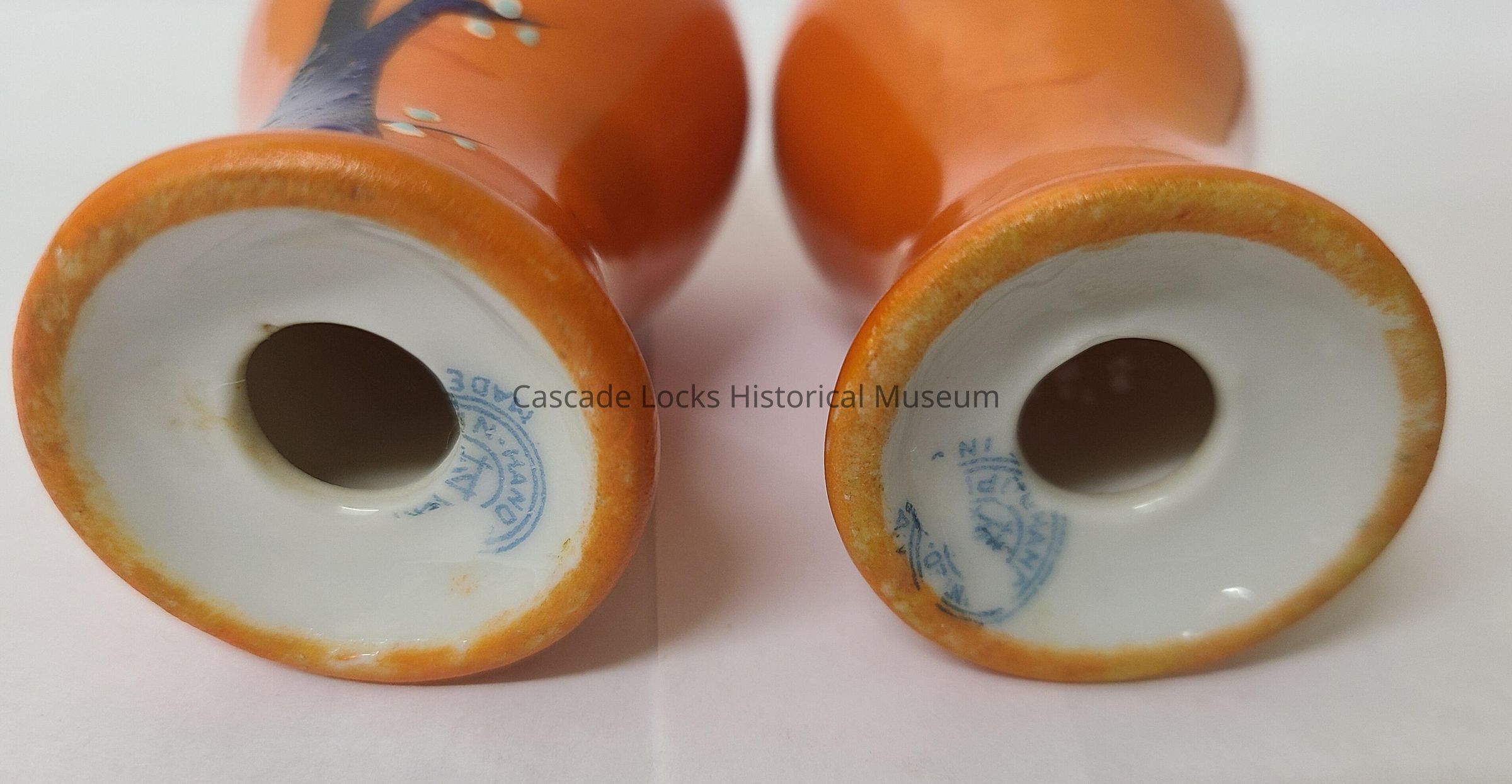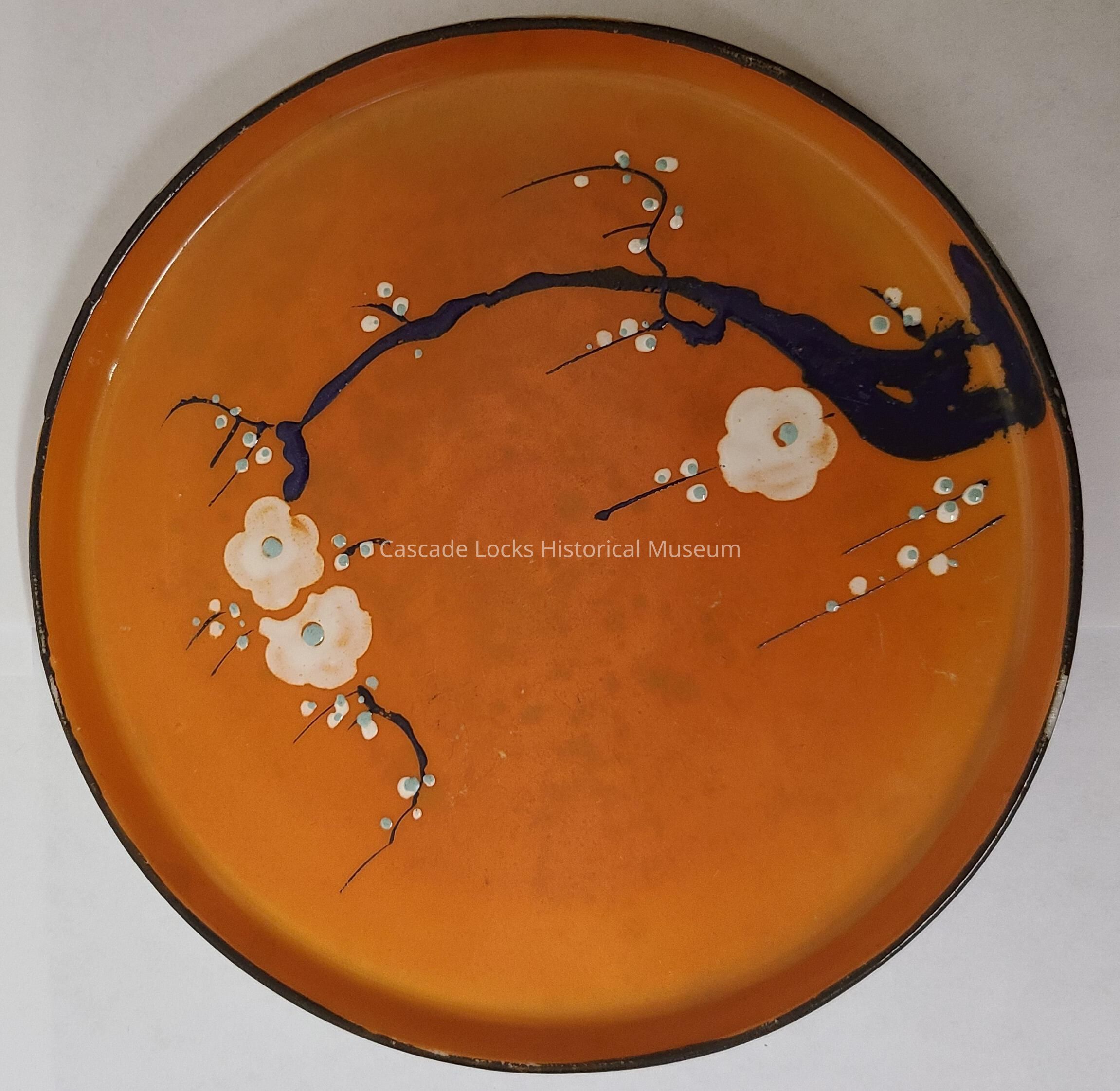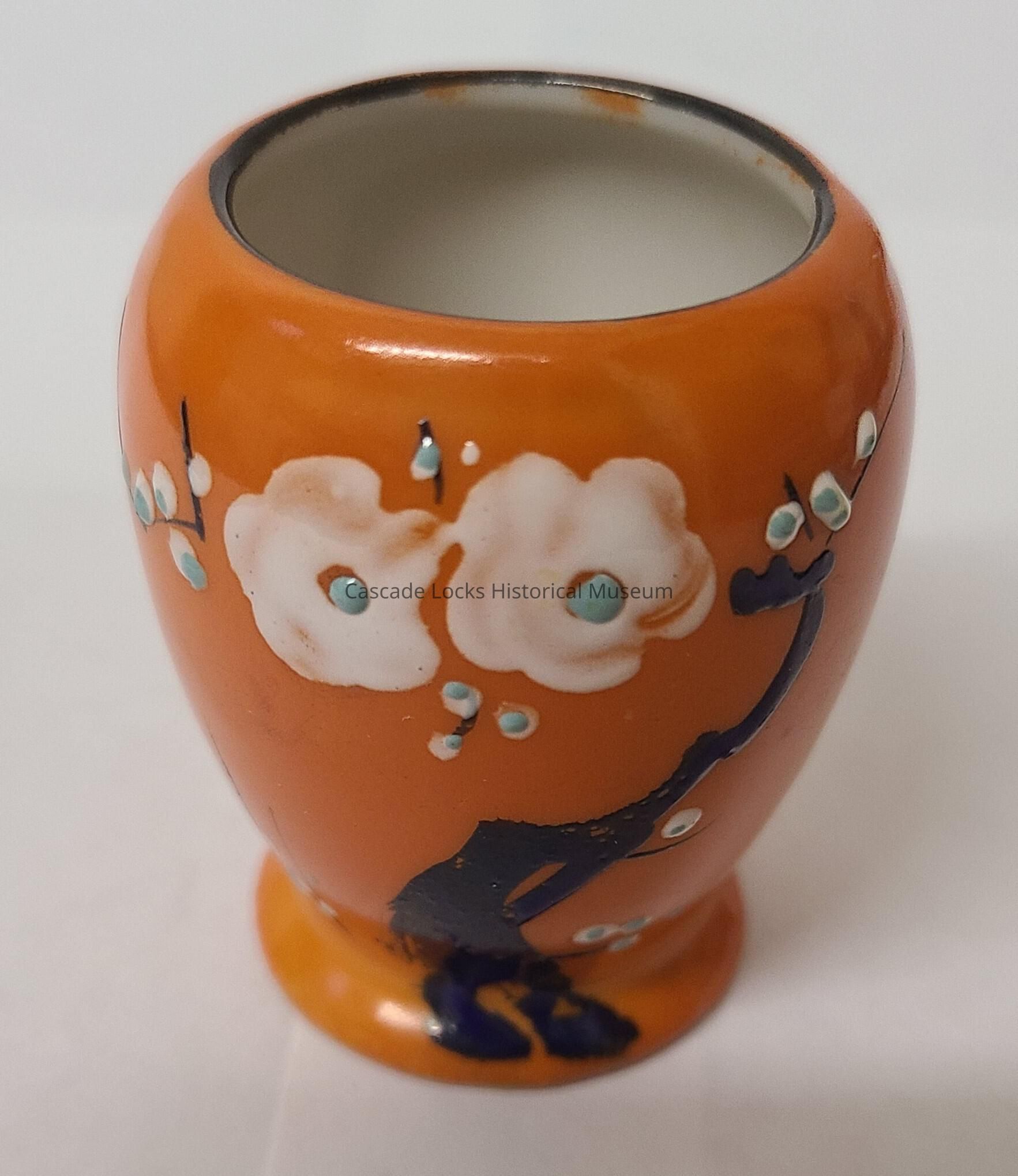 White ceramic with orange glaze and painted glazed blue trees with white flowers and teal accents dots.