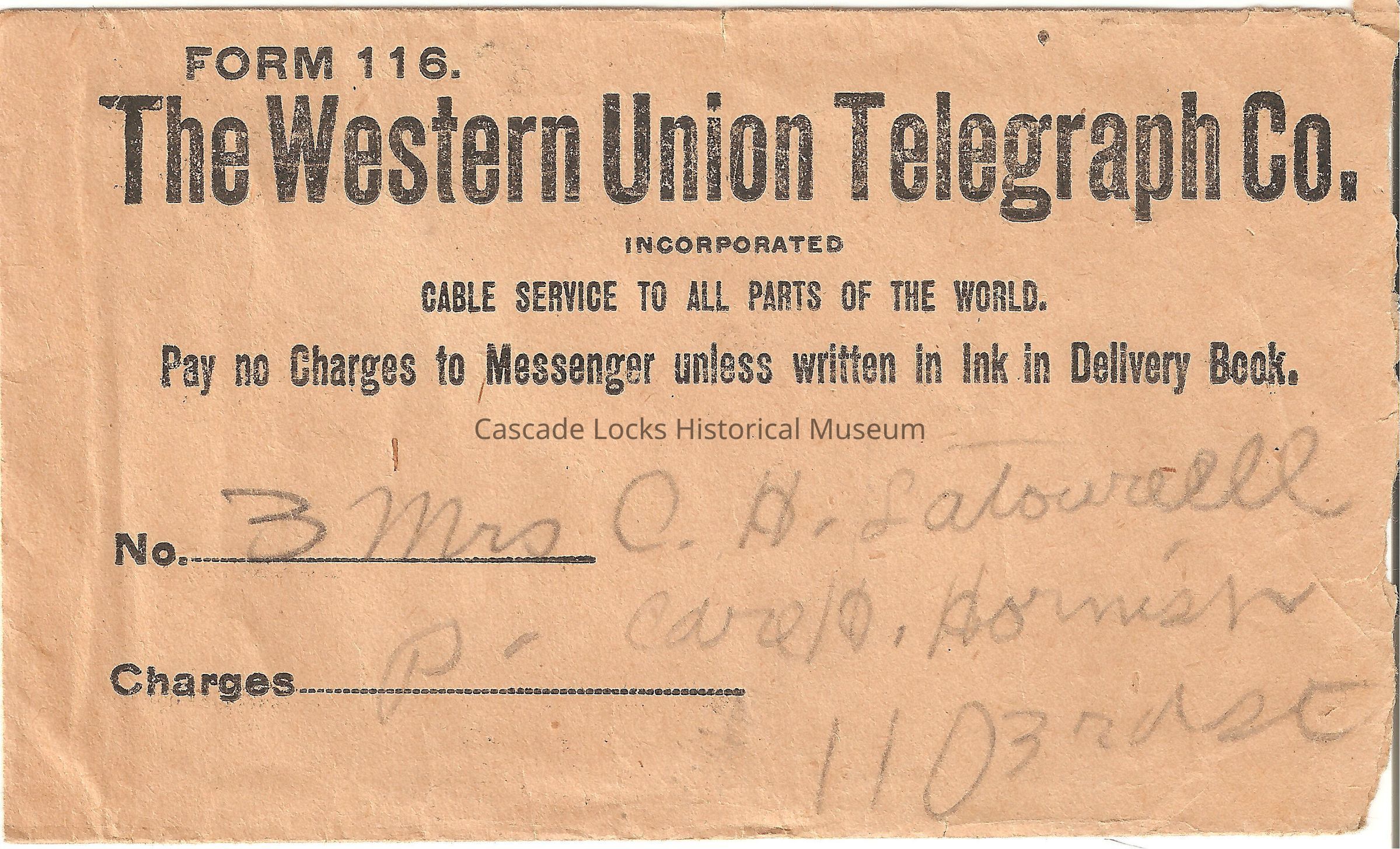 Form 116. The Western Union Telegraph Co. Incorporated. Cable service to all parts of the world. Pay no charge to messenger unless written in Ink in delivery book. No. 3 Mrs. C. H. Latourell. Charges P. Care 10 Hornish 110 3rd St.