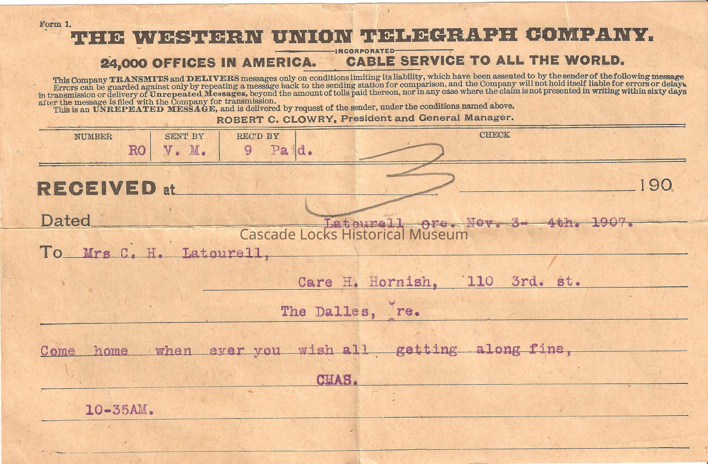 Number RO. Sent by V. M., Rec'd at 3, 190-, Dated Latourell Ore. Nov. 3-4th. 1907. To Mrs. C. H. Latourell, Care H. Hornish, 110 3rd St. The Dalles, Ore. Comne home when ever you wish all getting along fine, Chas. 10-35 am.