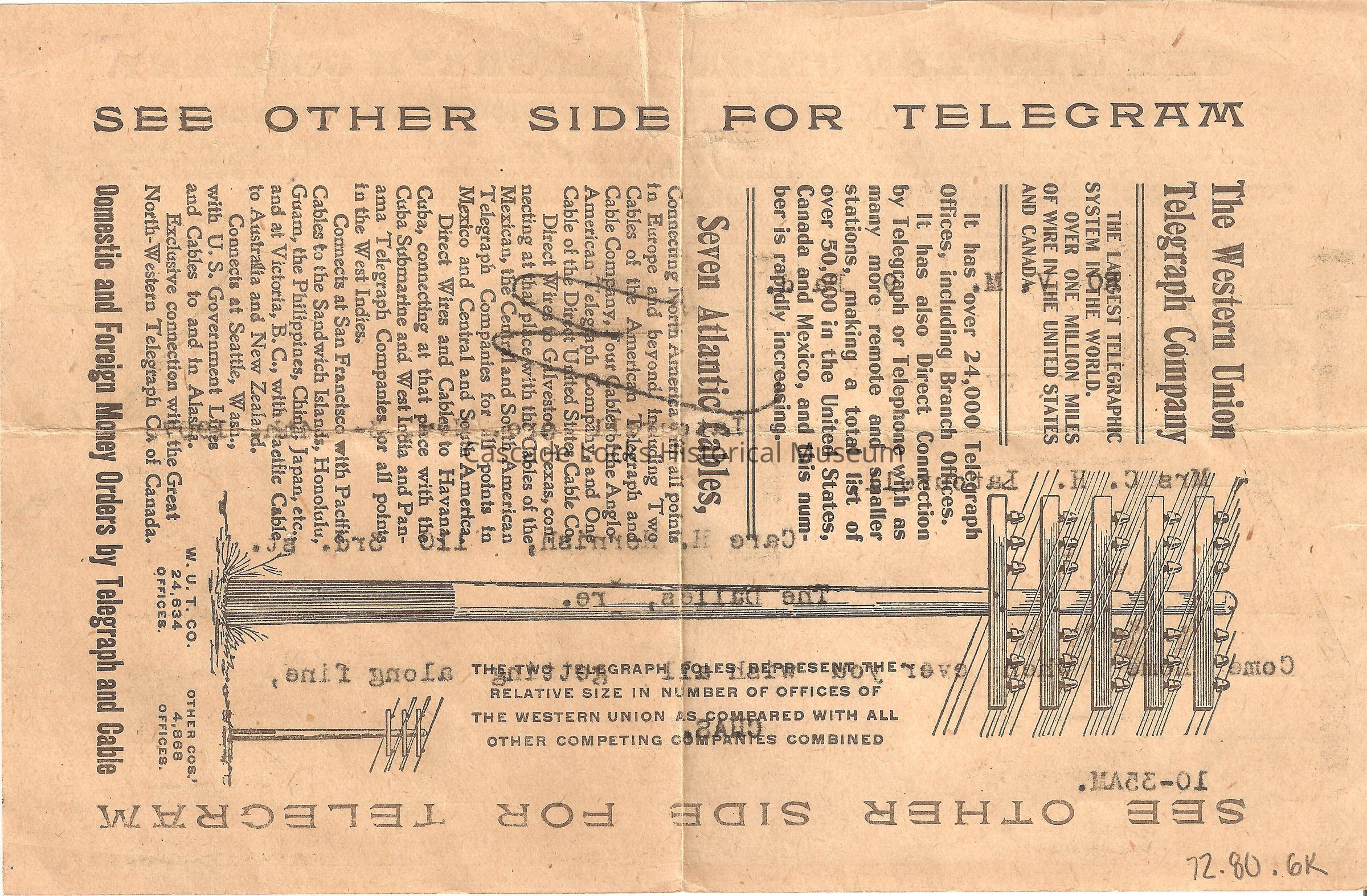 Seven Atlantic cables, connecting North America with all points in Europe and beyond including Two cables of the American Telegraph Company, and one cable of the Direct United States Cable Co. Direct wires to Galveston Texas, connecting at that place with the cables of the Mexican, the Central and South American Telegraph Companies for all points in Mexico and Central and South America. Direct wires and cables to Havana, Cuba, connecting at the place with the Cuba Submarine and West India and Panama Telegraph Companies for all points in West Indies. Connects at San Francisco with pacific cables to the sandwich Islands Honolulu, Guam, the Philippines, China, Japan, Etc. and at Victoria, B. C., with Pacific cable to Australia and New Zealand. Connects Seattle, Wash., with US Government lines and cable to and in Alaska. Exclusive connection with the Great North Western Telegraph Co. of Canada. Domestic and Foreign Money Orders by Telegraph and Cable. W. U. T. Co. 24,634 Offices. Others Cos' 4,868 Offices. The Two telegraph poles represented the relative size in number of offices of Western Union as compared with all other competeling companies combined.
