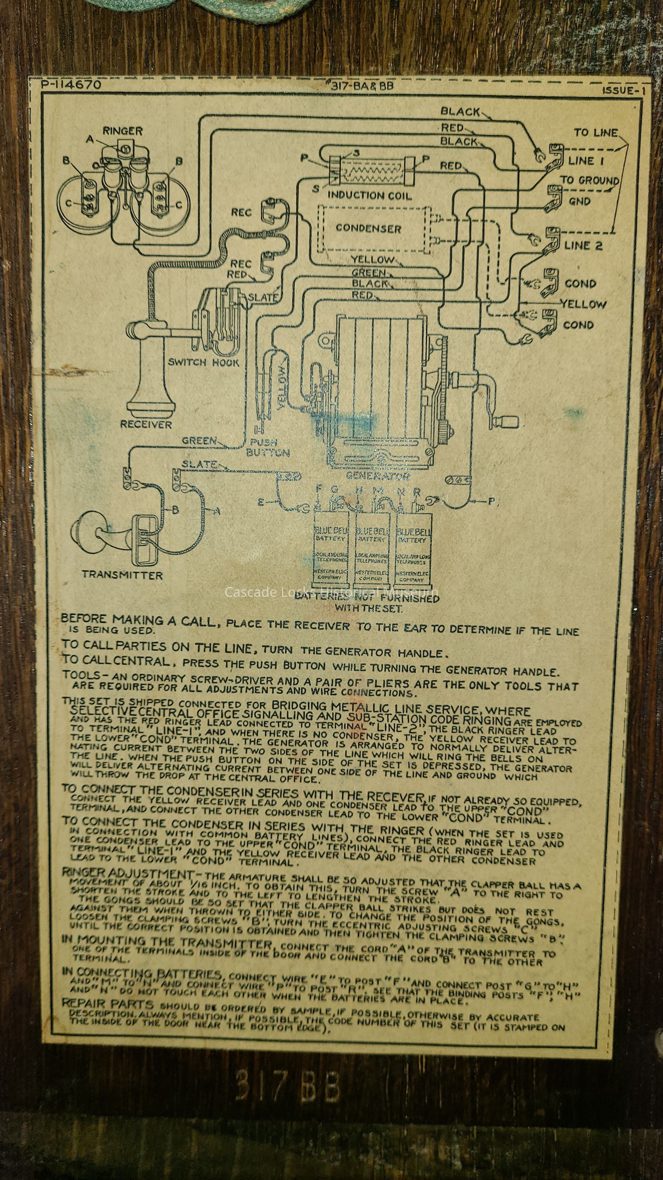 1) Inside the from door of the box is an a model of how the phones parts function and instructions for use. There is also numbers listed on the top of the model. P-114670, 317-BA & BB, Issue-1.