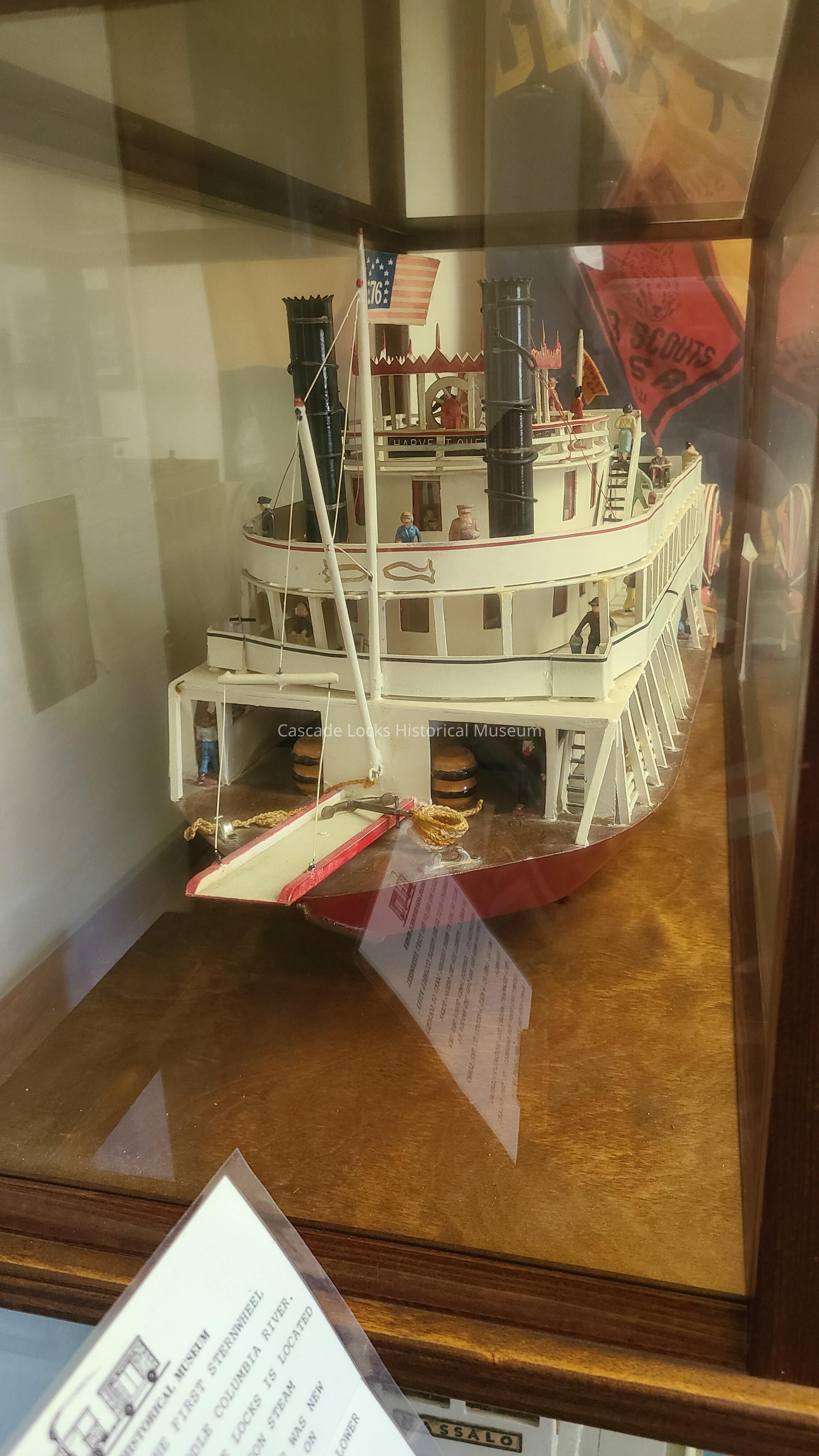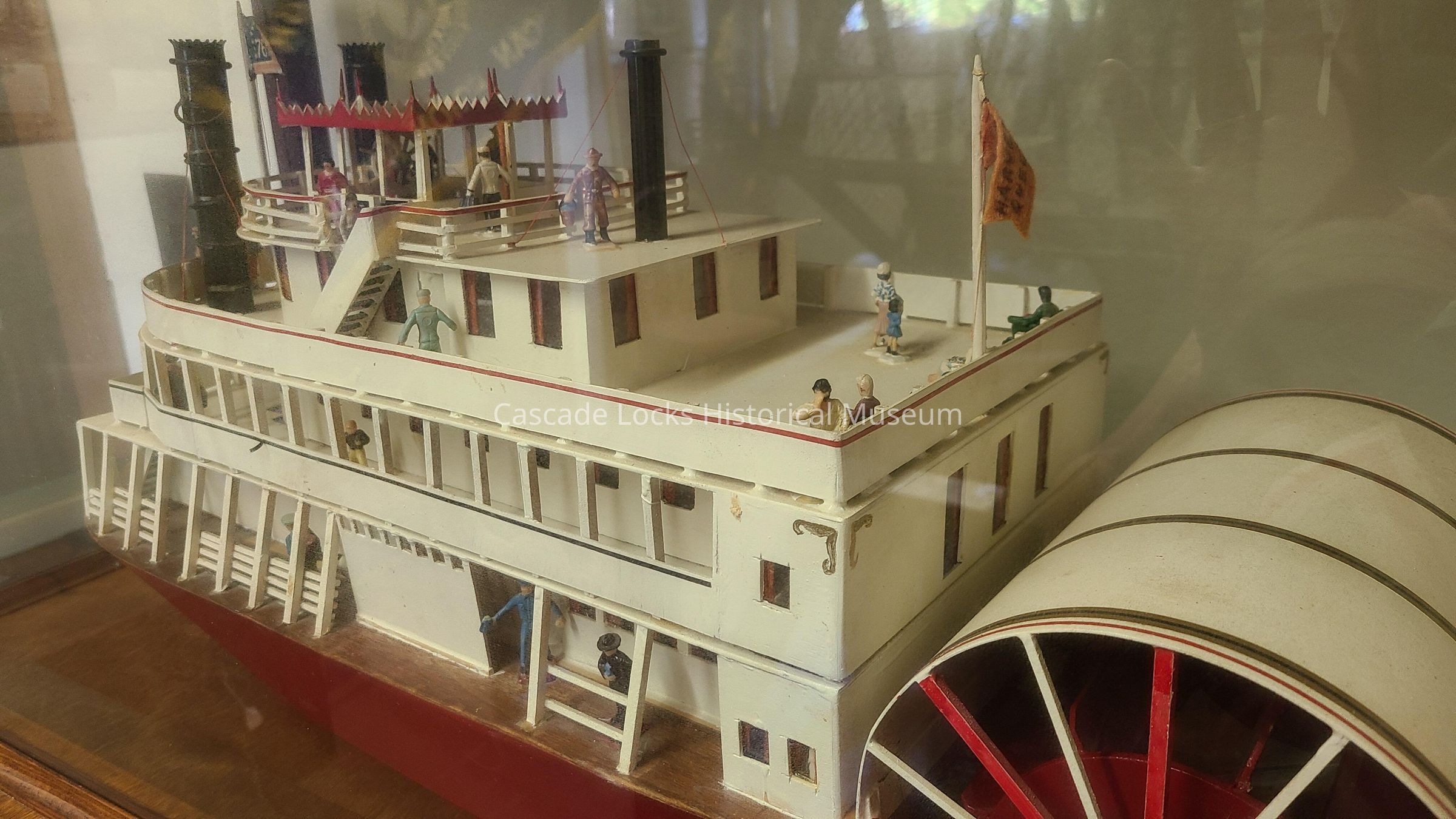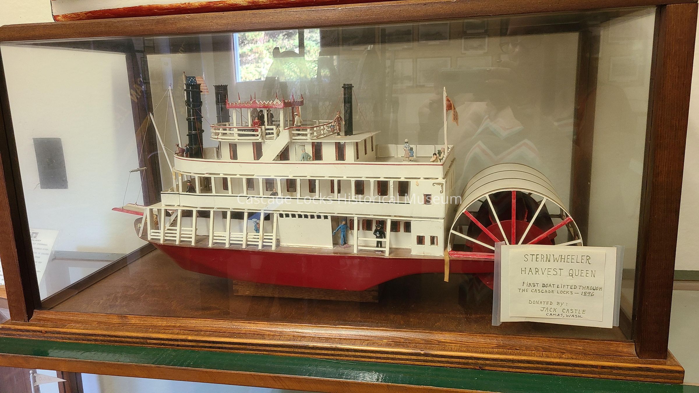 Model replica boat the Harvest Queen. Model is motorized. Boat is white with red bottom base and red details. There are small plastic people on the boat. The back of the boat there is a large wheel housed in a large making it a steamer ship. Boat is housed in its own glass case.