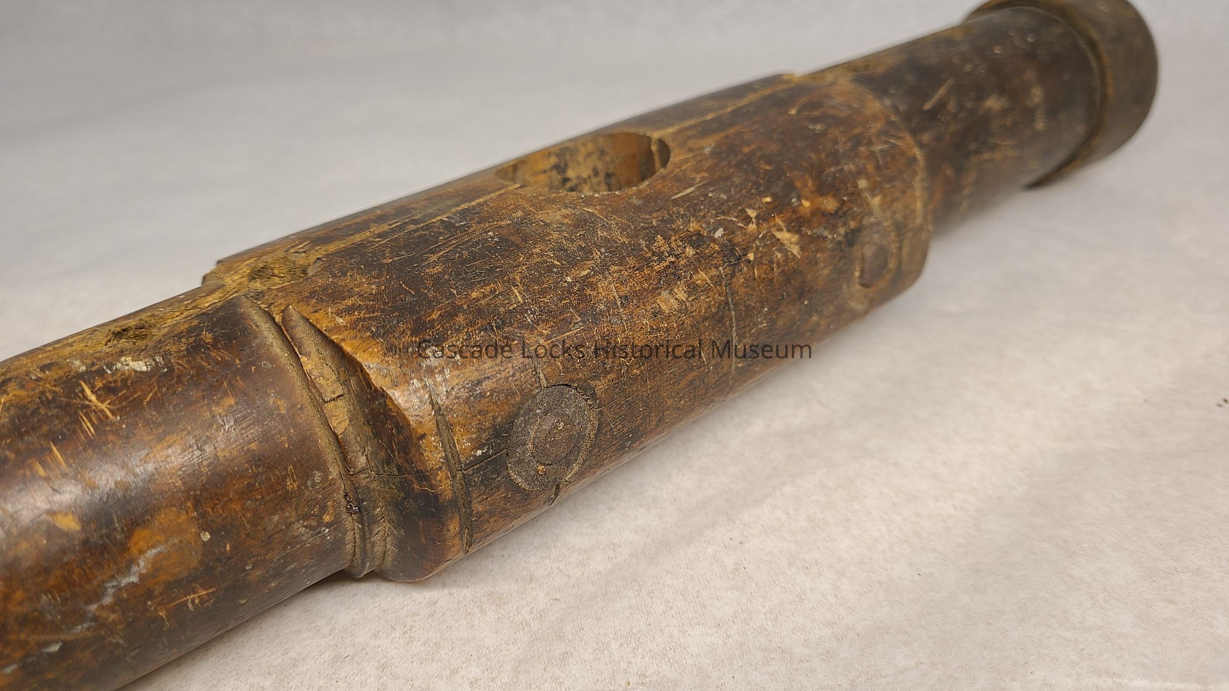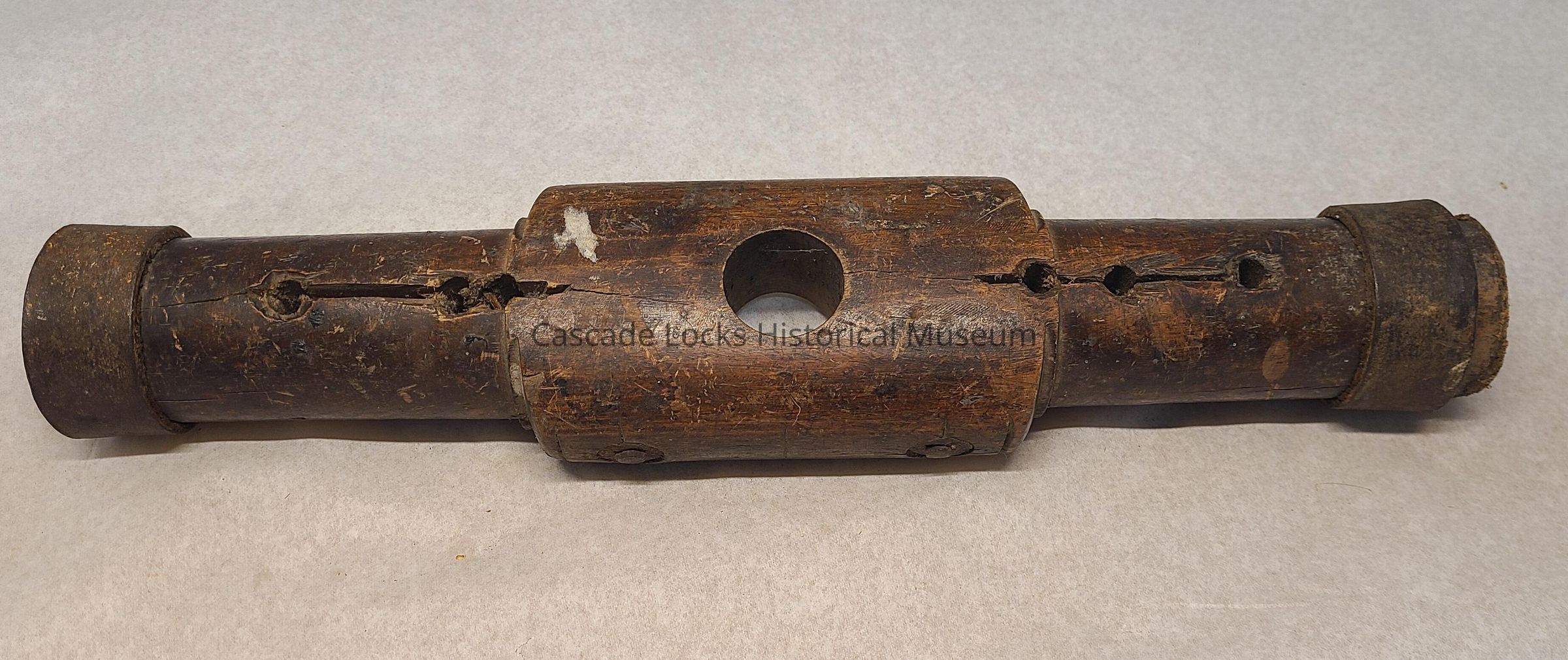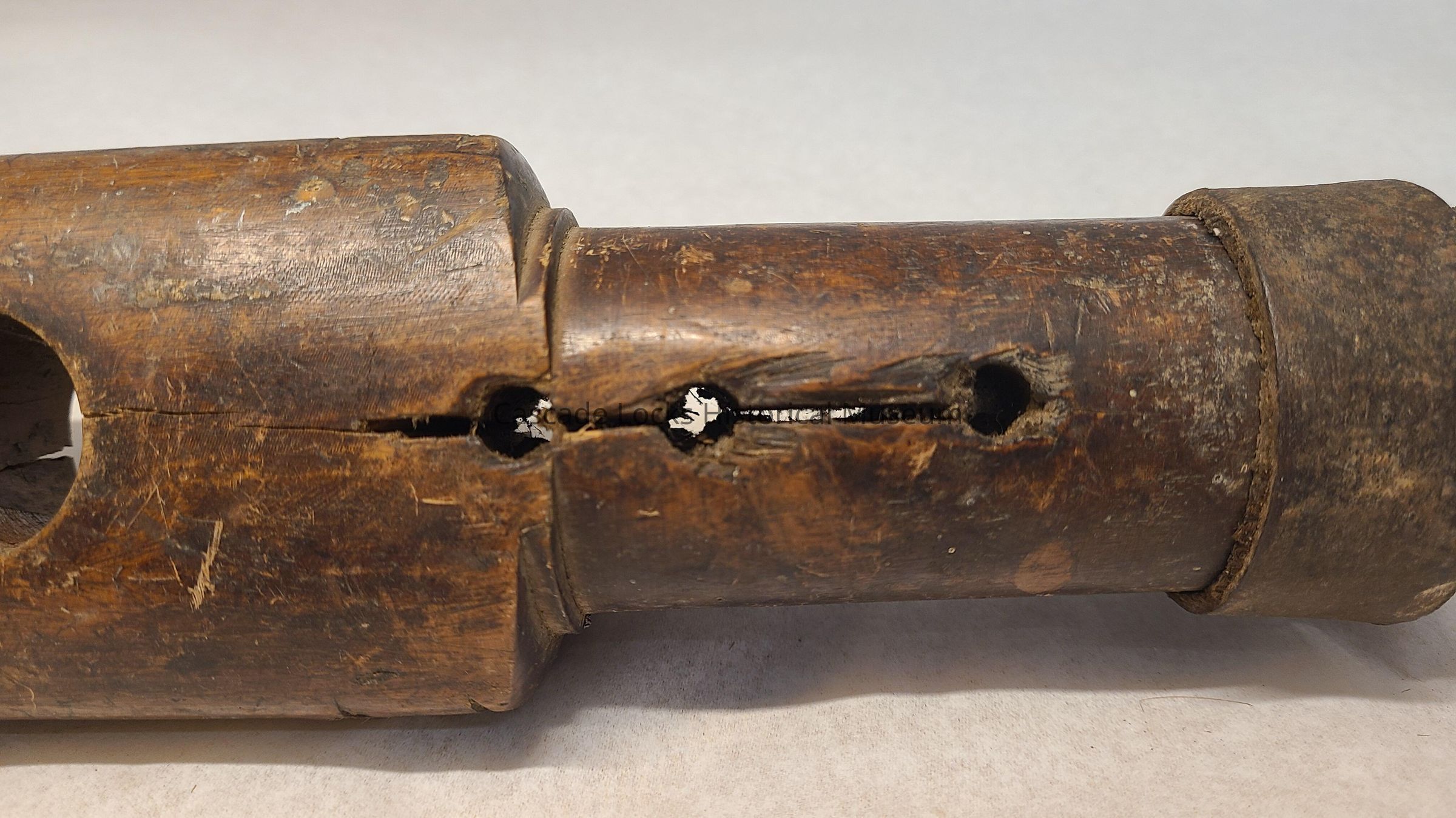 Item is made of wood. It is long and rectangular with a large hole in the middle, fallowed by three small holes and either side. There is two small metal pieces on the middle sides of the item and two large metal rings on either the end of the item.
