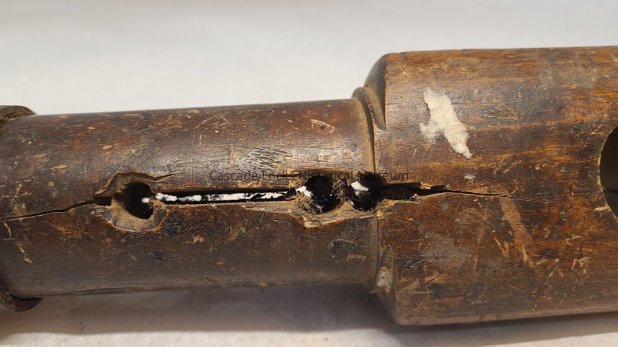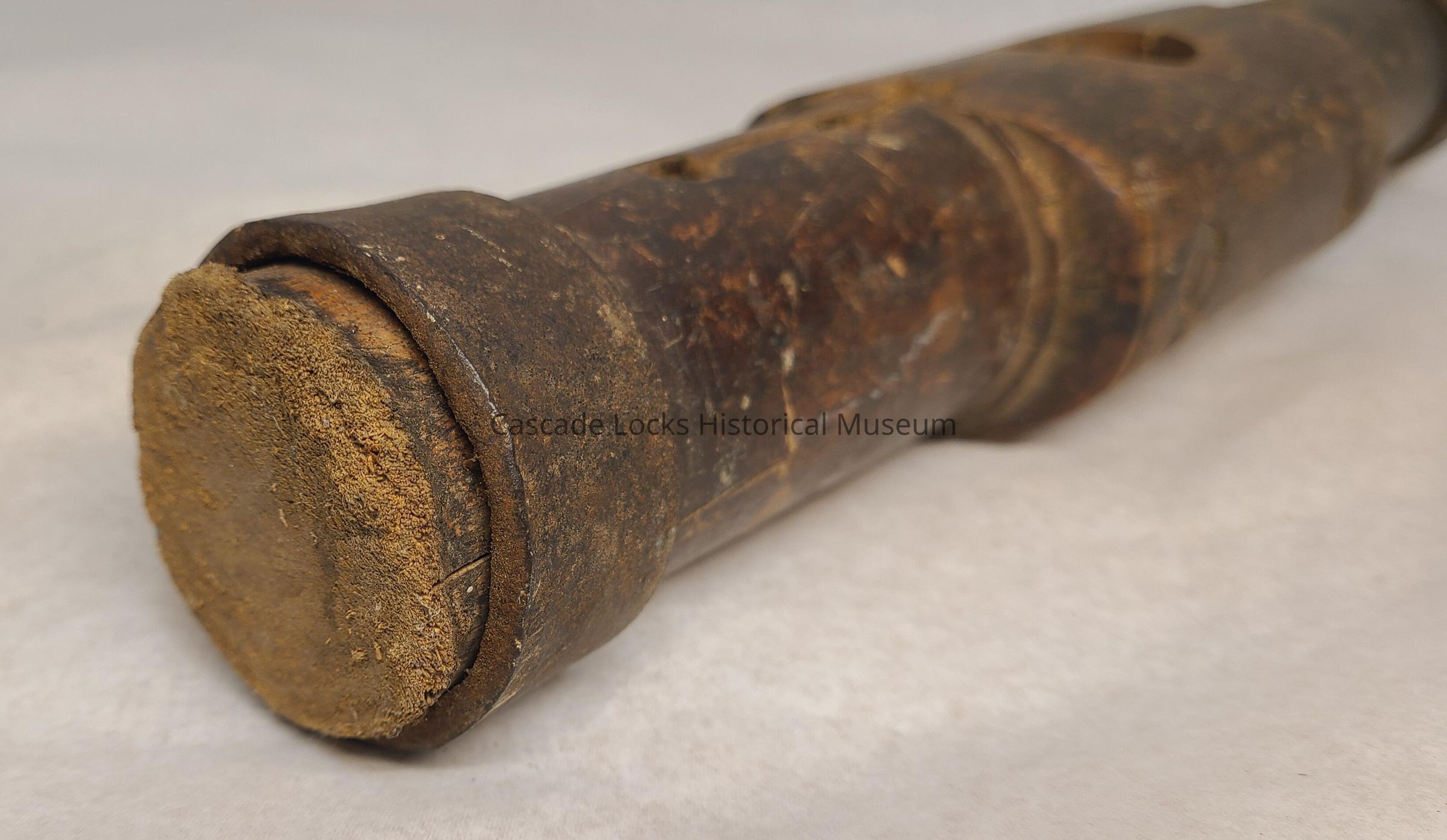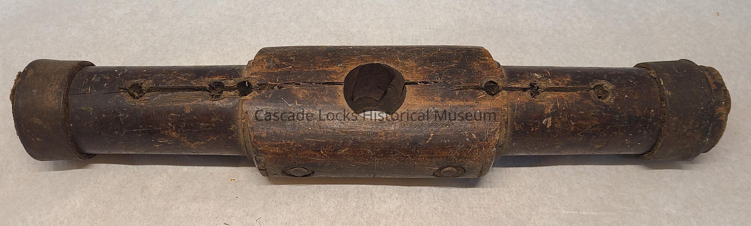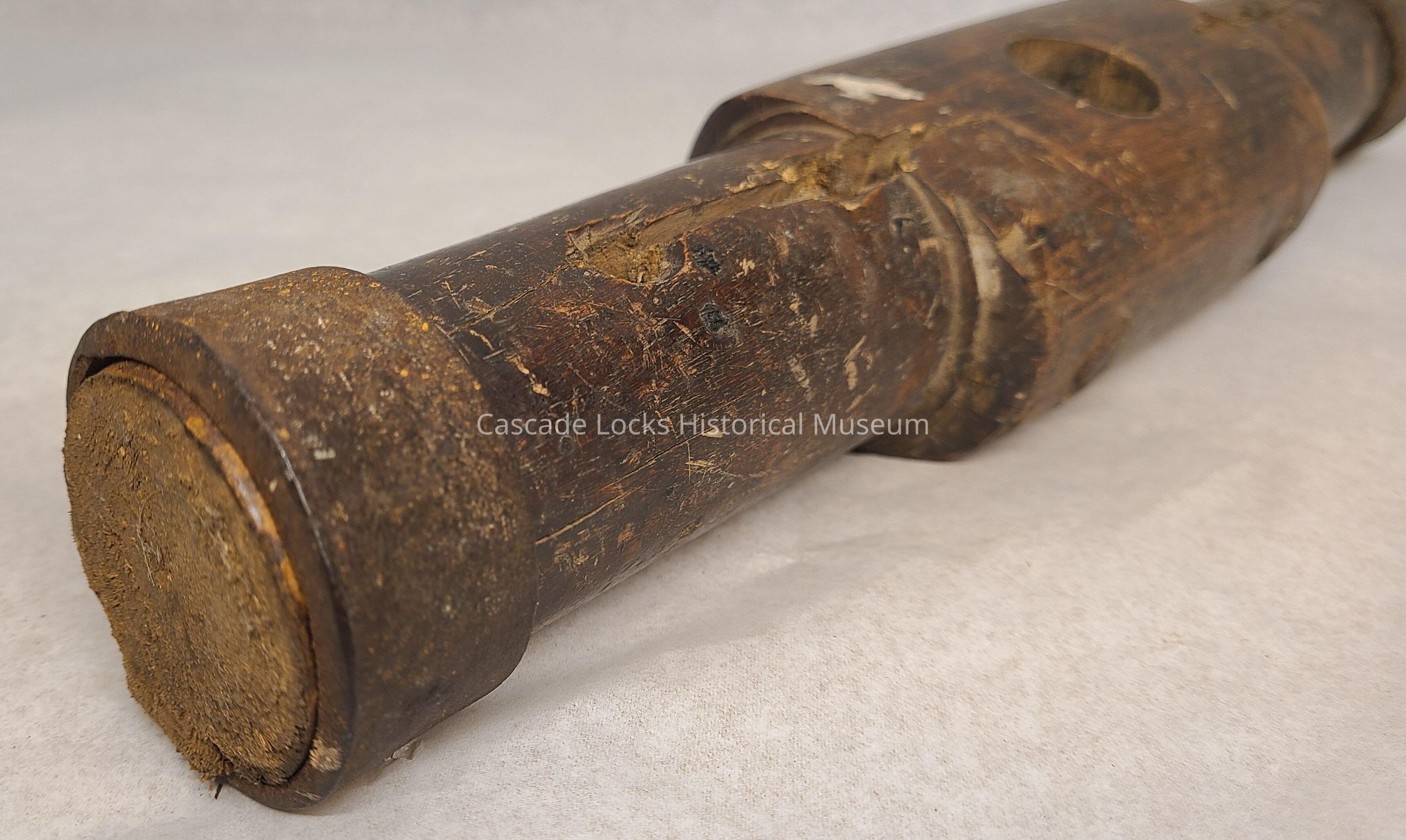 Item is made of wood. It is long and rectangular with a large hole in the middle, fallowed by three small holes and either side. There is two small metal pieces on the middle sides of the item and two large metal rings on either the end of the item.