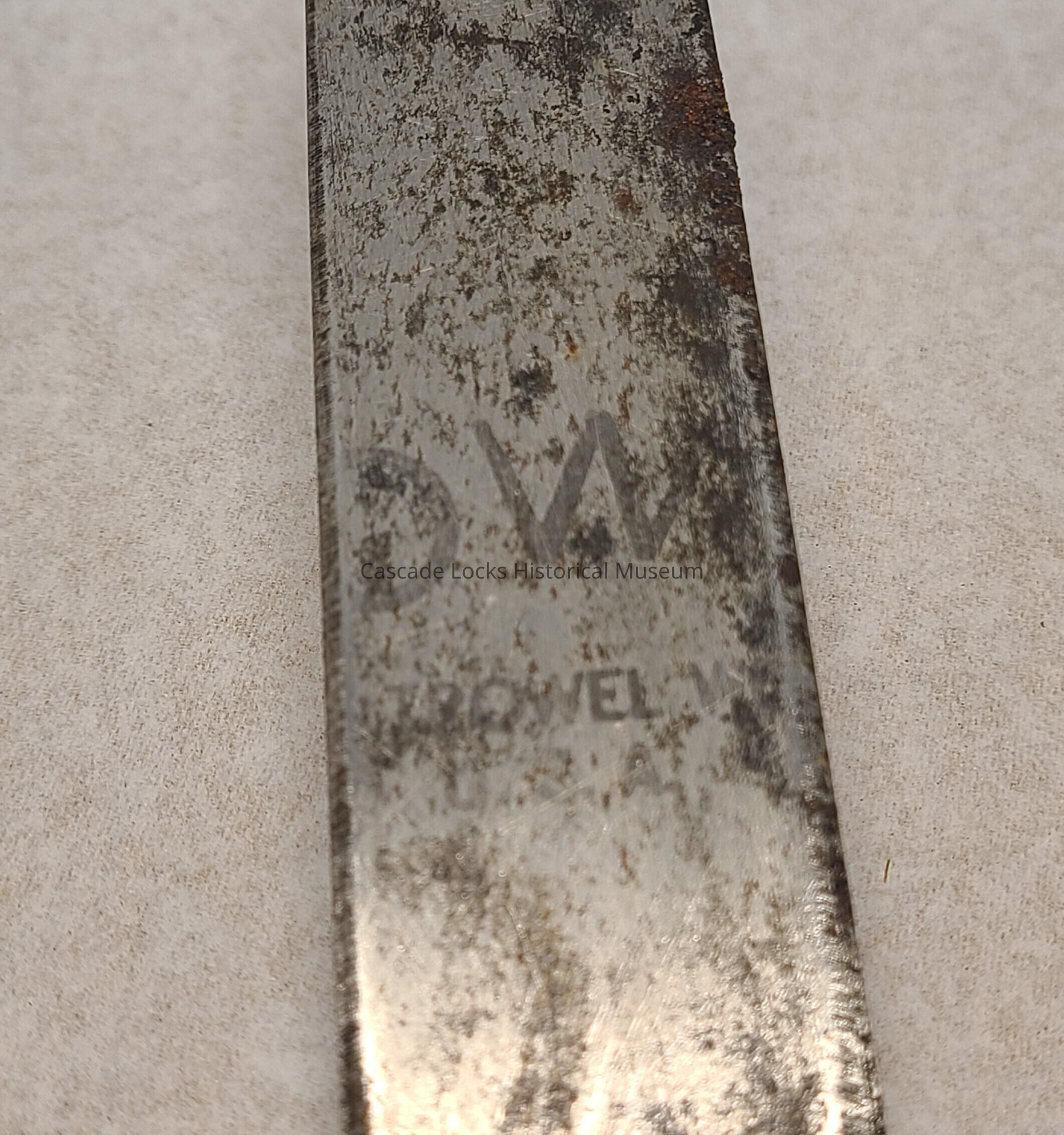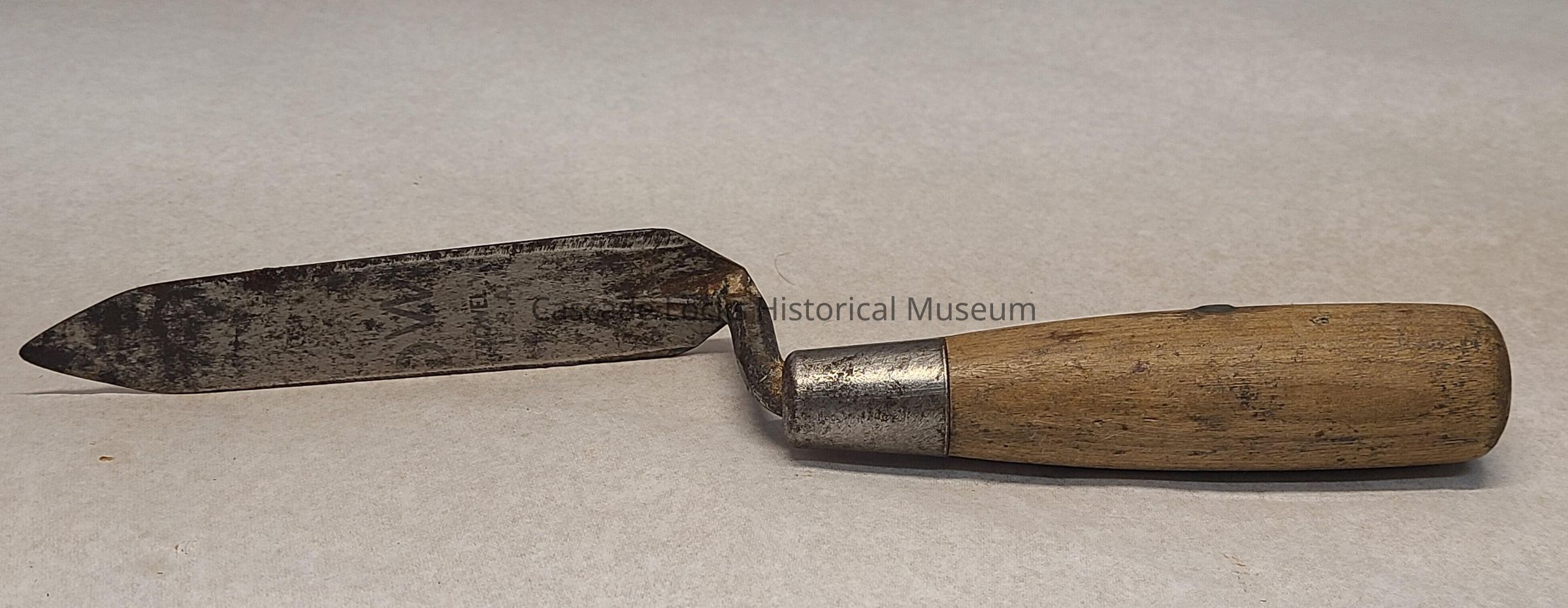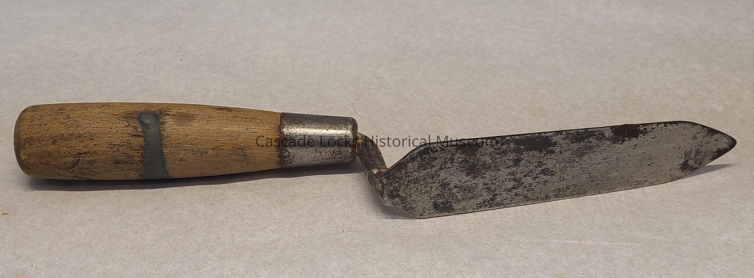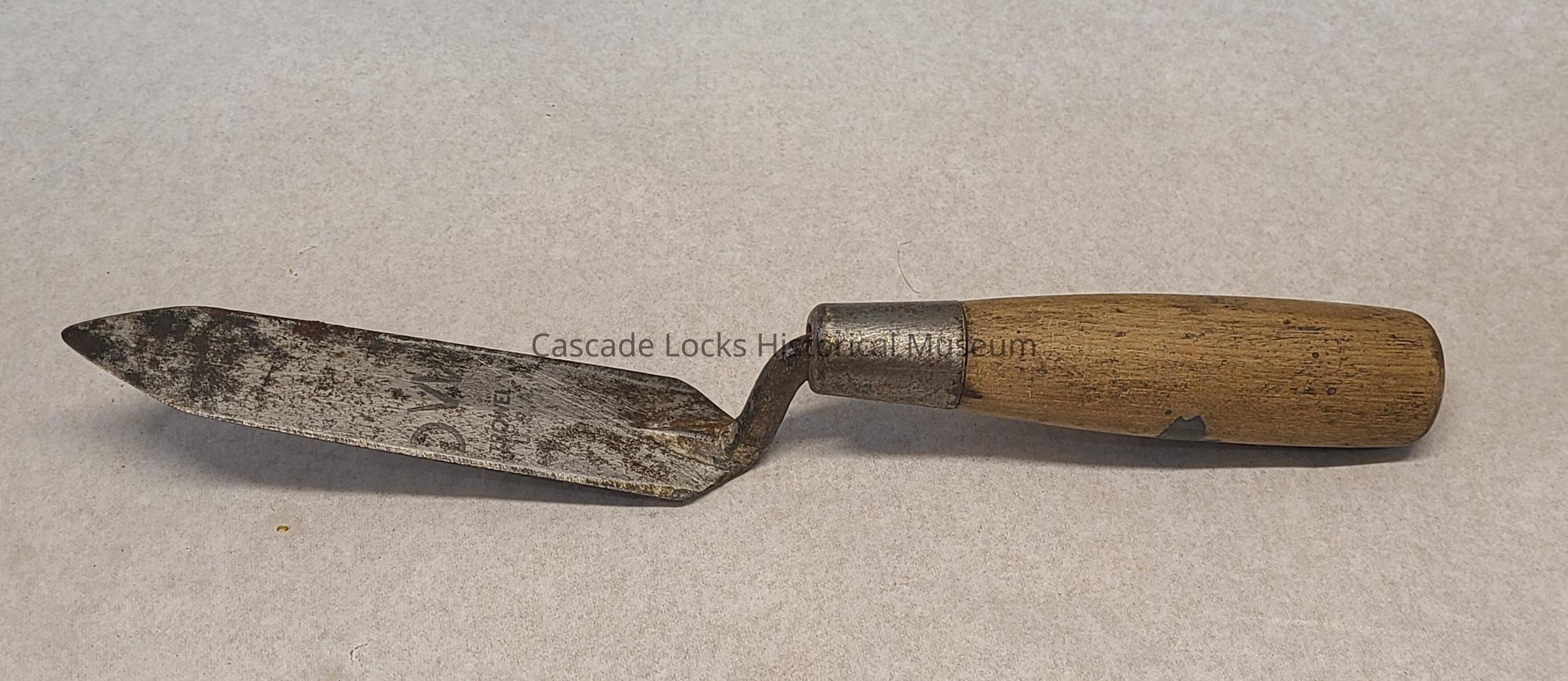 Wooden handle is tan with dark wear and residue spots. The metal head of the trowel is overall silver in color with with dark tarnish. There is red/brown rust on and around the blade with white bloom.