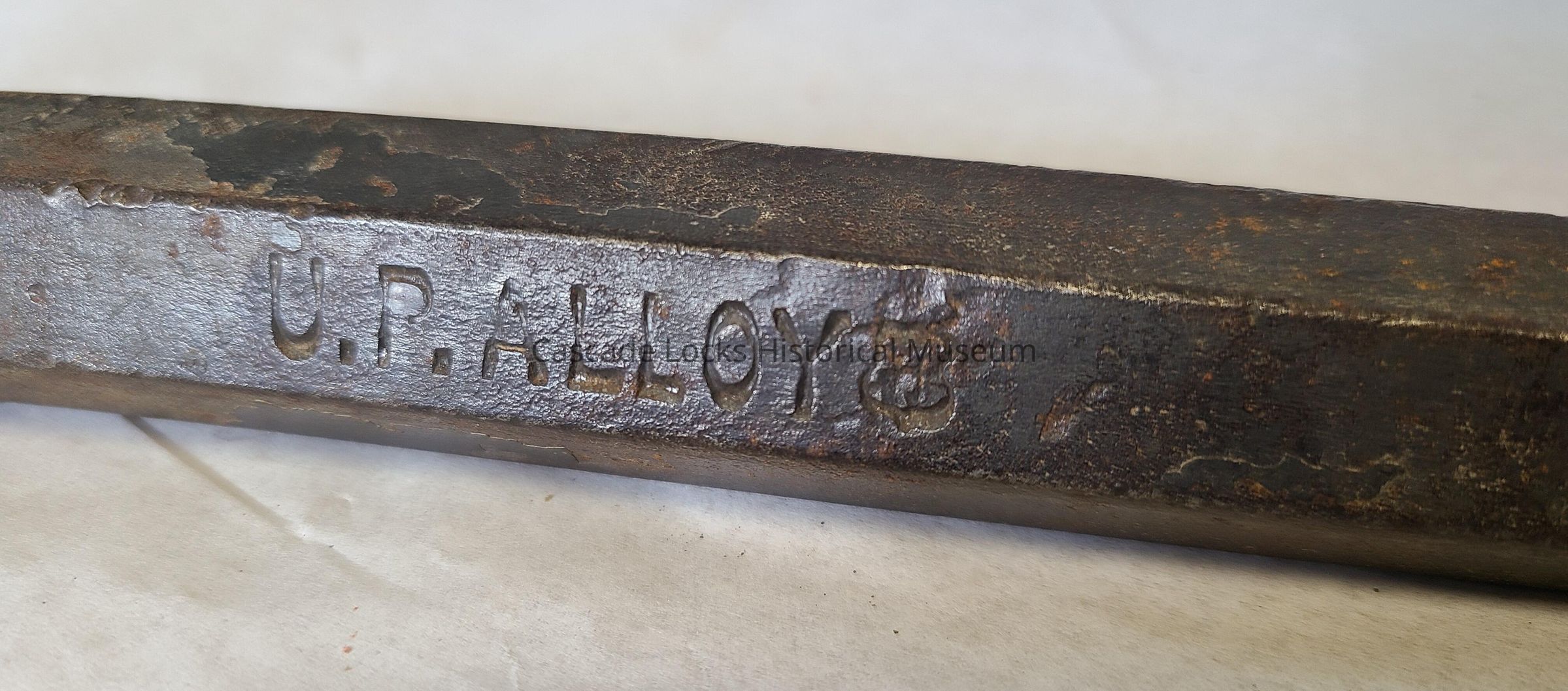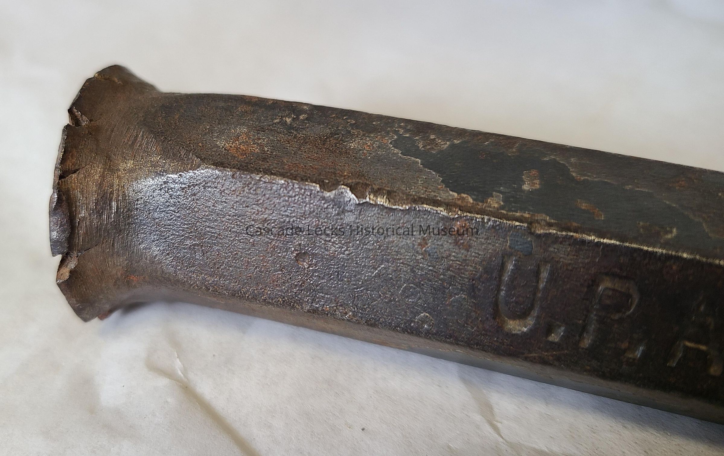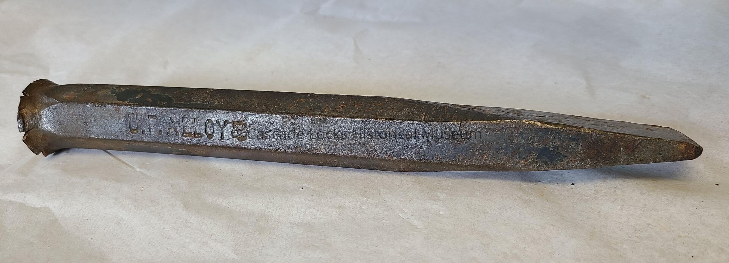 Cast iron chisel with splintered end from force of impact. There is a stamp on the side of the chisel that reads, "U. P. Allots."