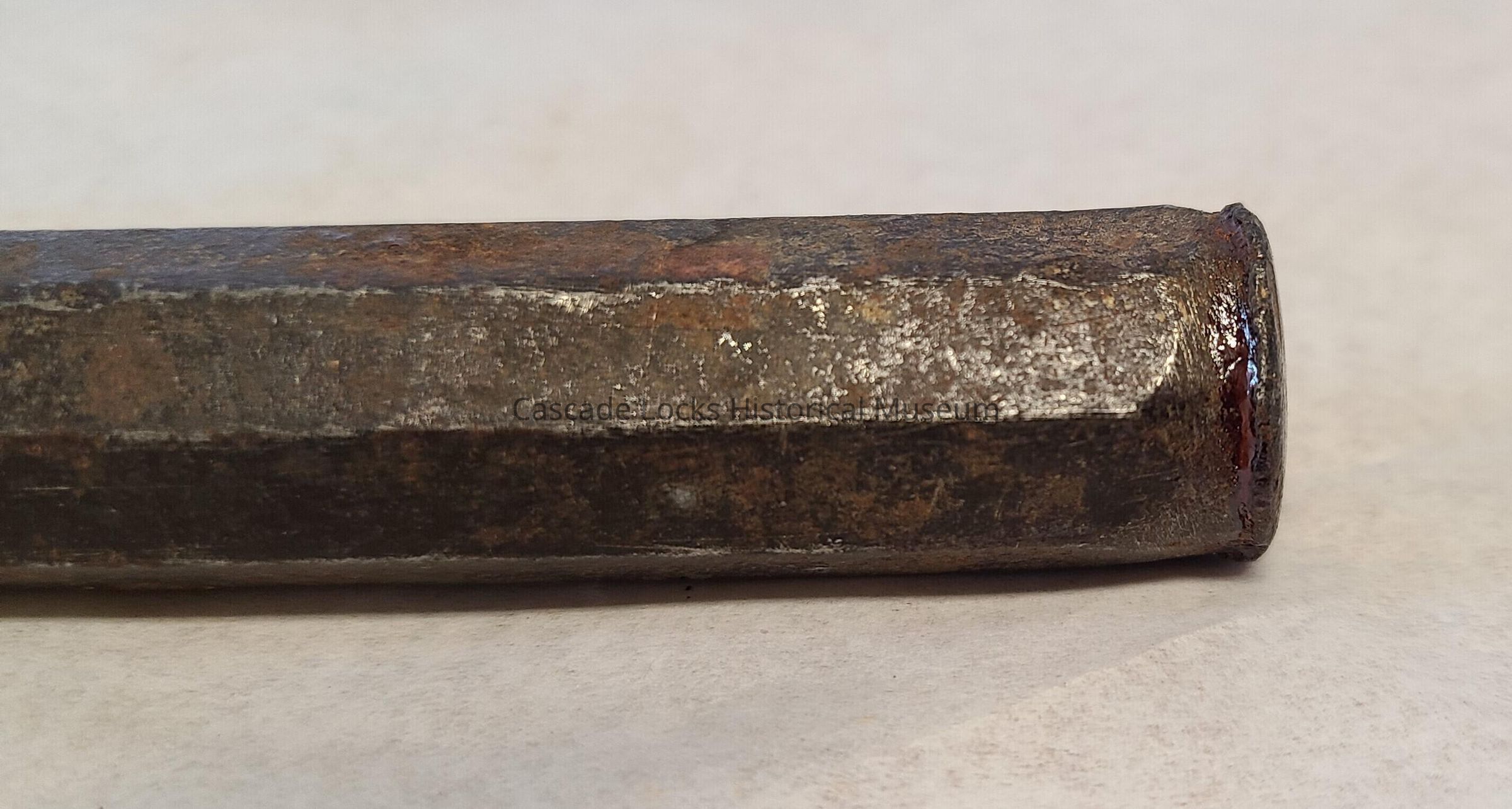 Cast iron chisel with splintered end from force of impact. There is a stamp on the side of the chisel that reads, "U. P. Allots."