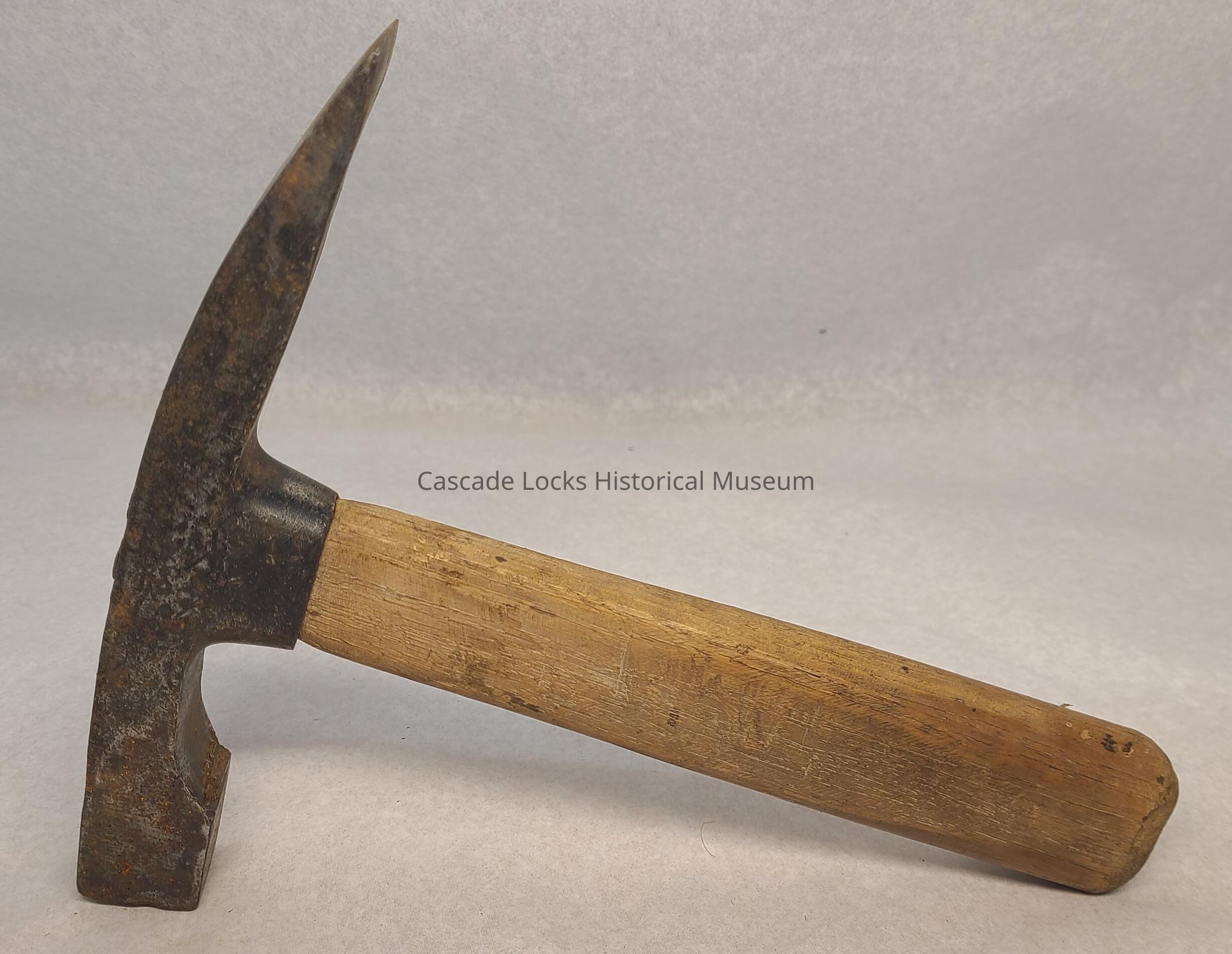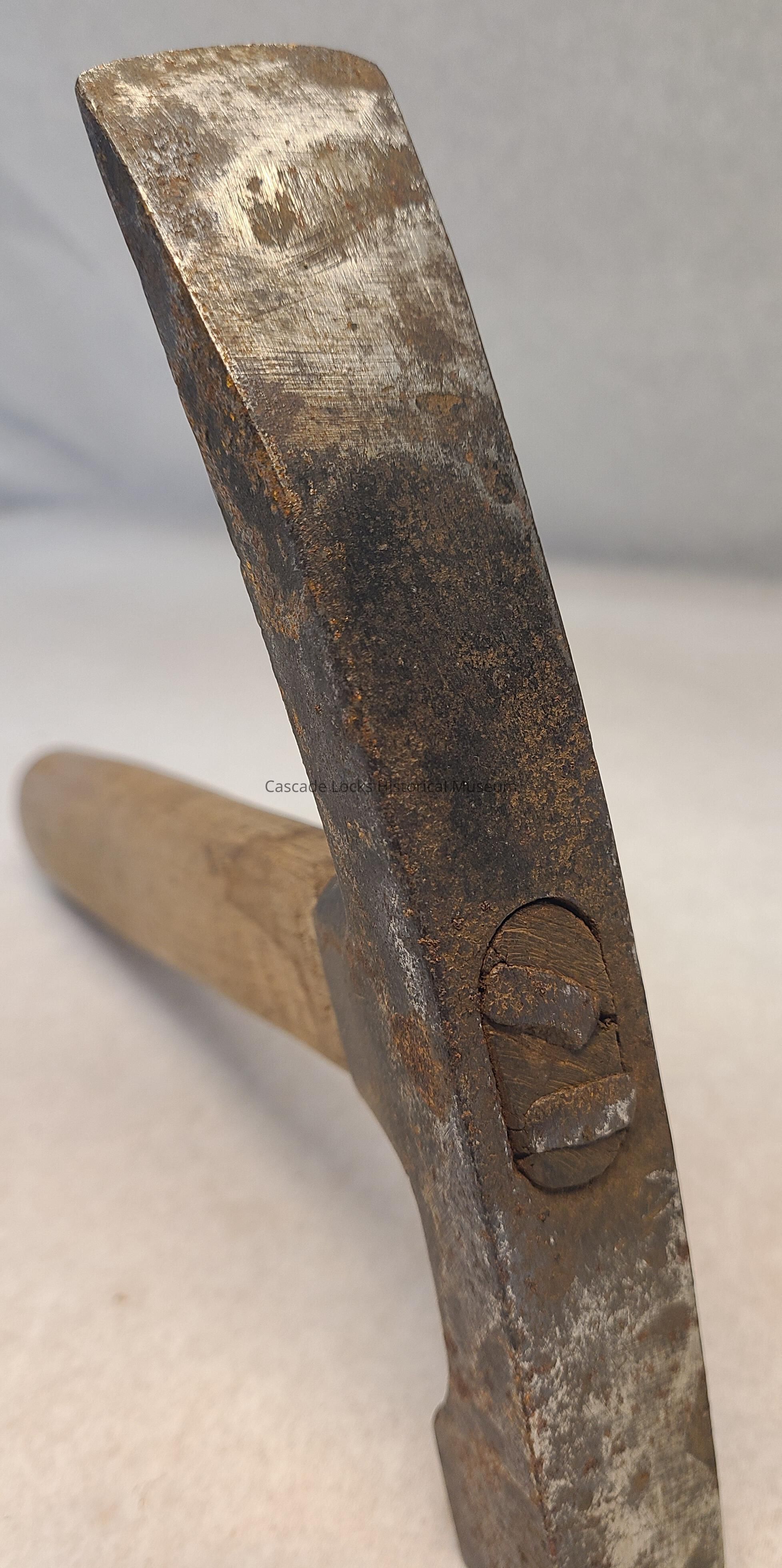 Wooden handle is tan wood. The metal head of the pick is overall dark in color with silver showing through abrasive scratches. In concave areas of the metal there is red/brown rust.