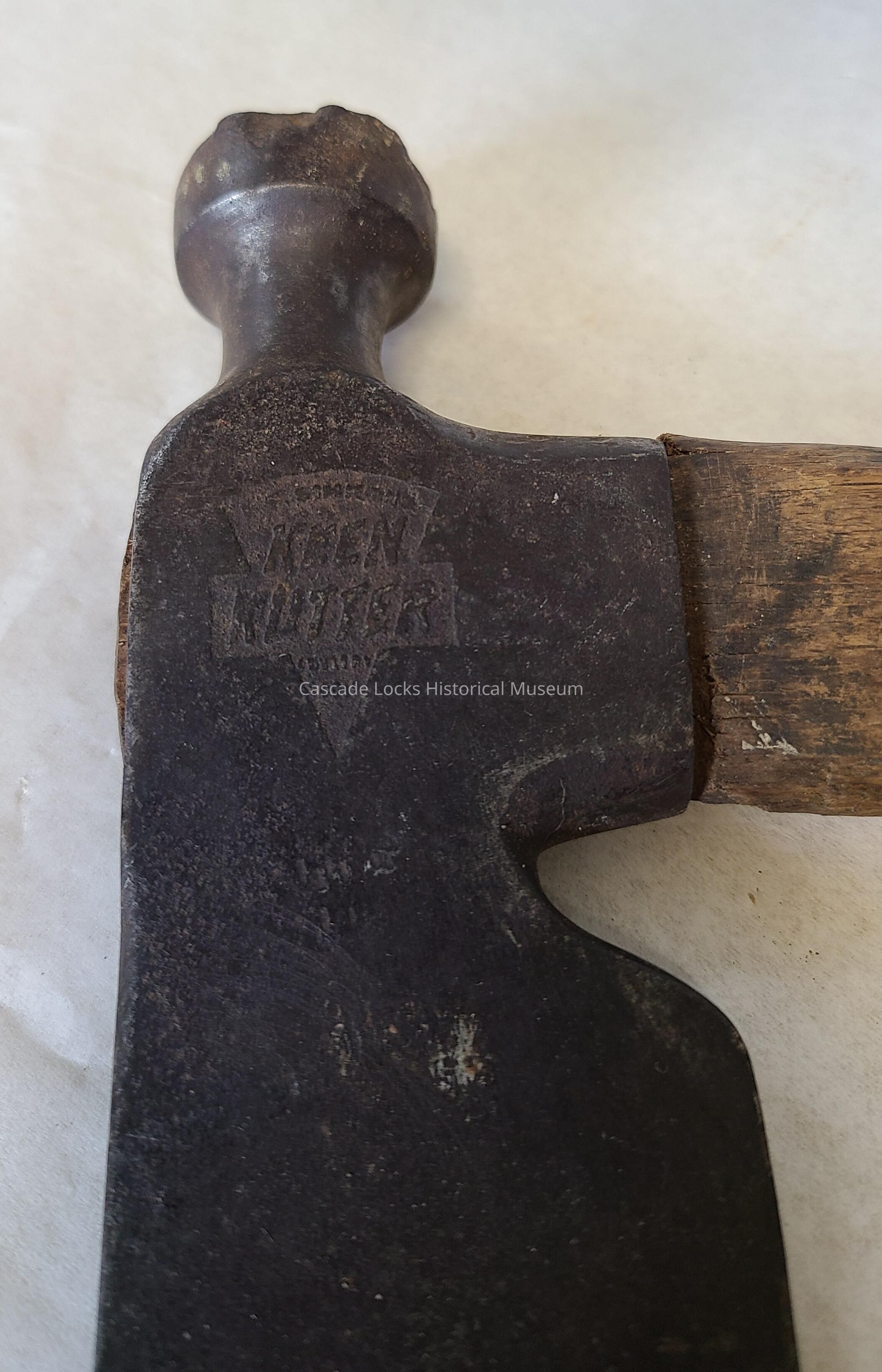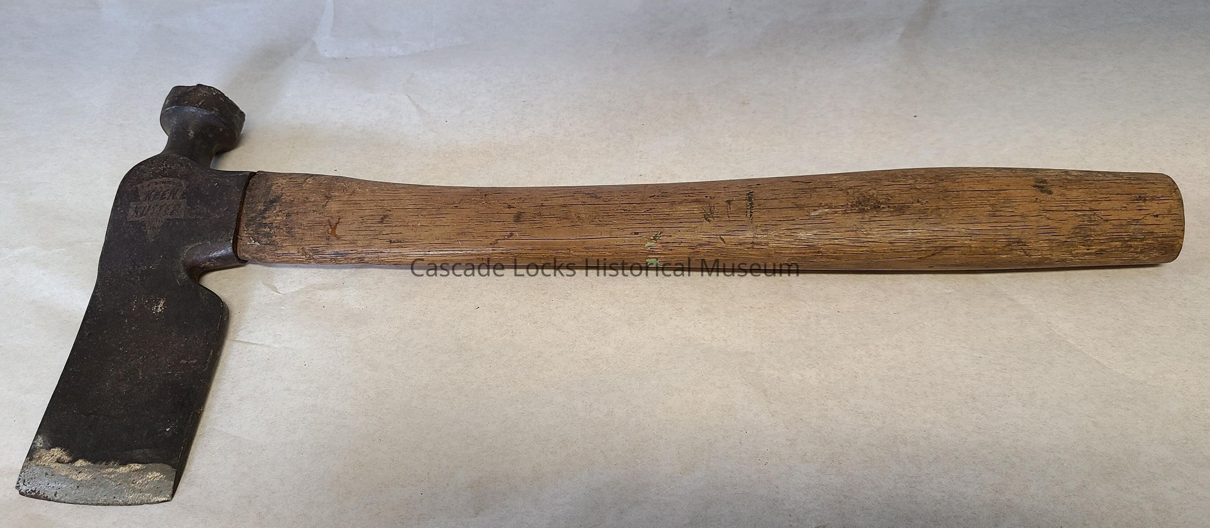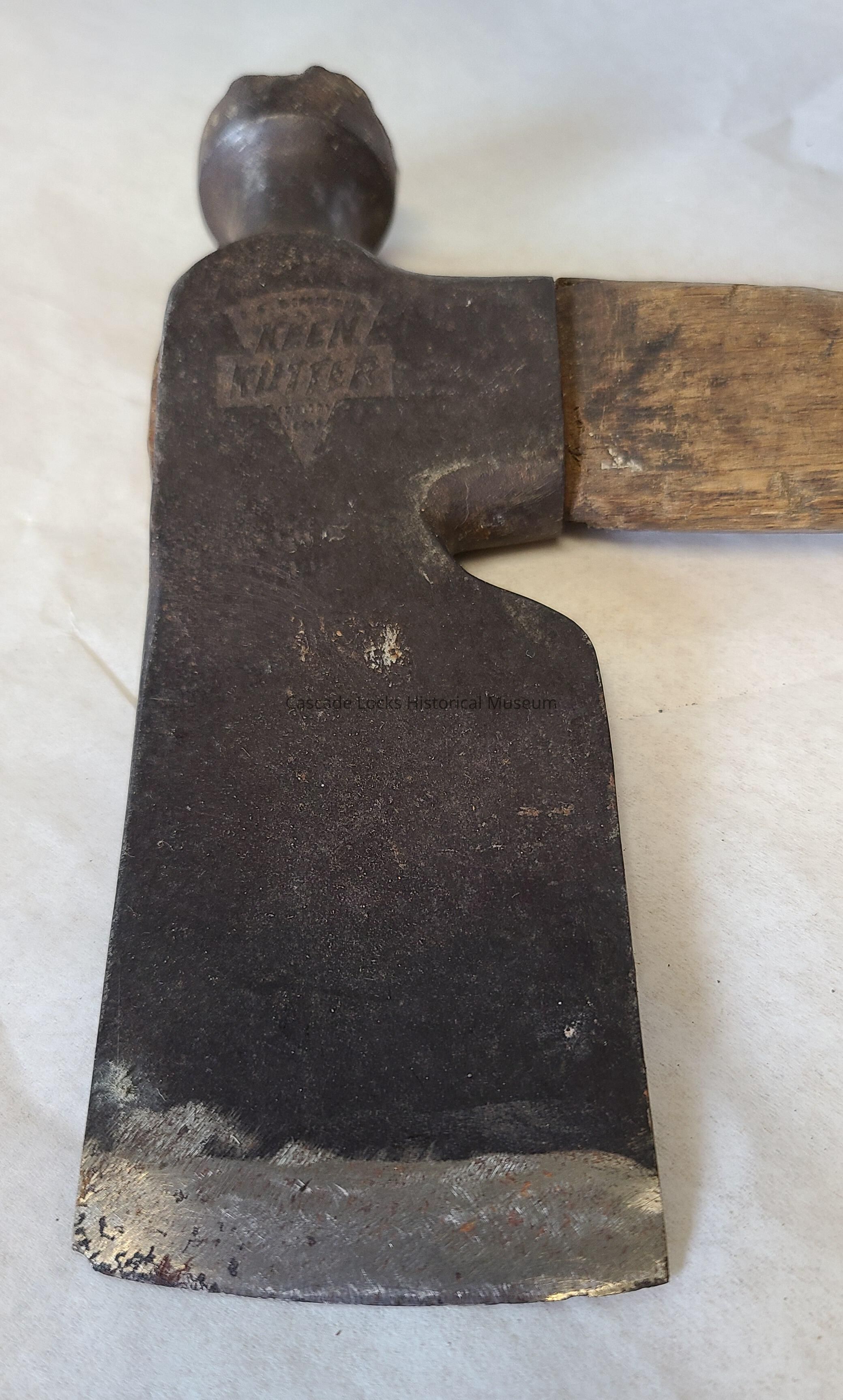 The metal head of the half hatchet is overall dark in color with silver showing through abrasive scratches and sharpened edge. In concave areas of the metal there is red/brown rust.